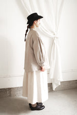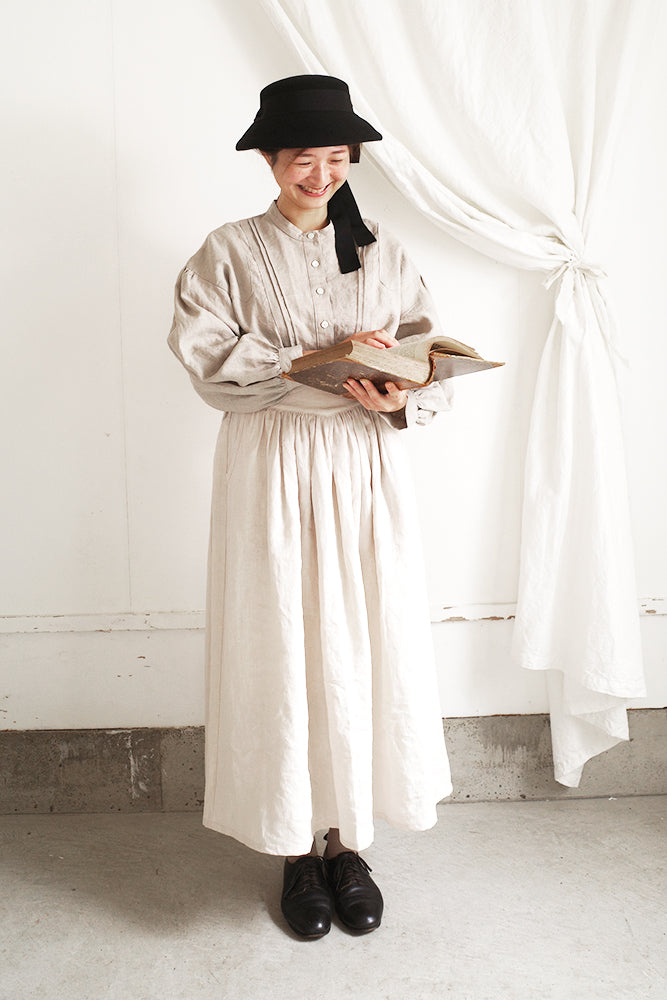 フォークロアな印象のリネンシャツです。肩から袖部分のパッチのデザインと前のタックがポイント。お色はチャコールグレーと生成りの二色です。【素材】麻 100% 【サイズ】着丈 70cm 身幅 56cm 袖丈 46cm