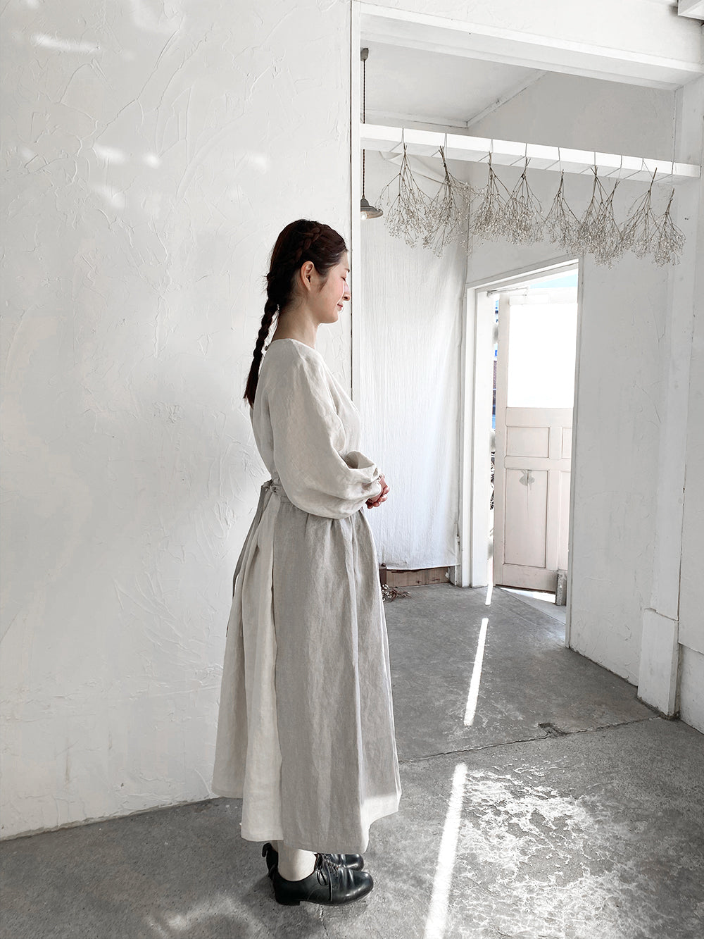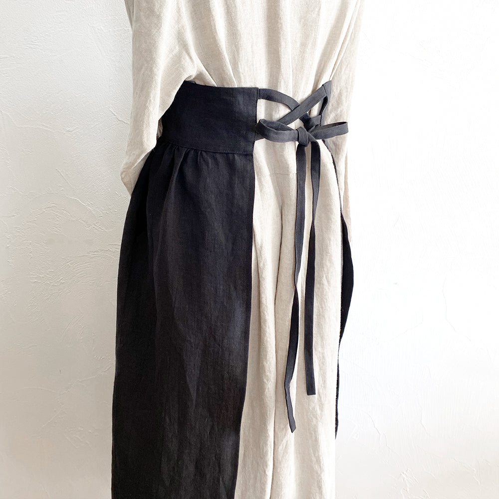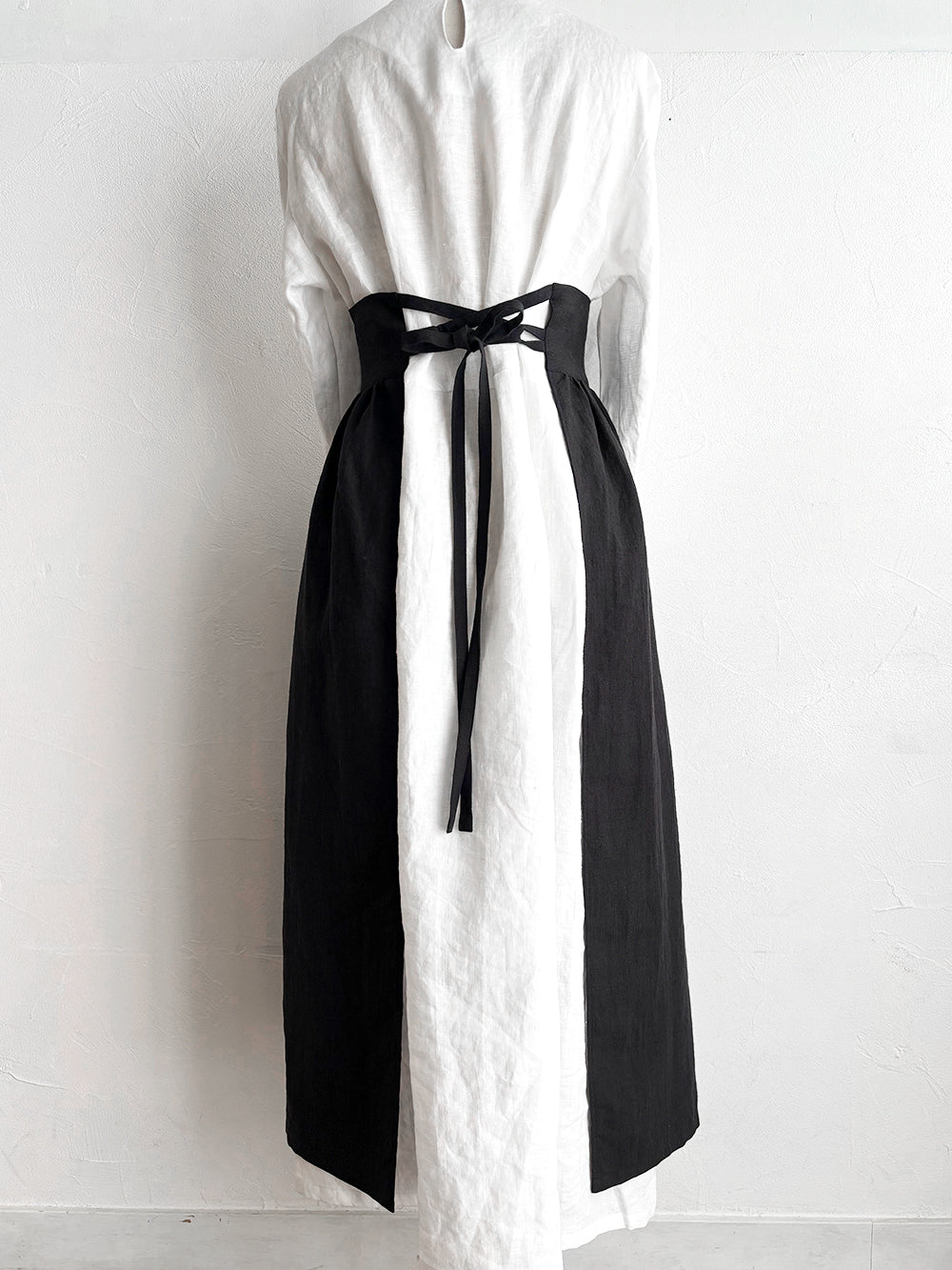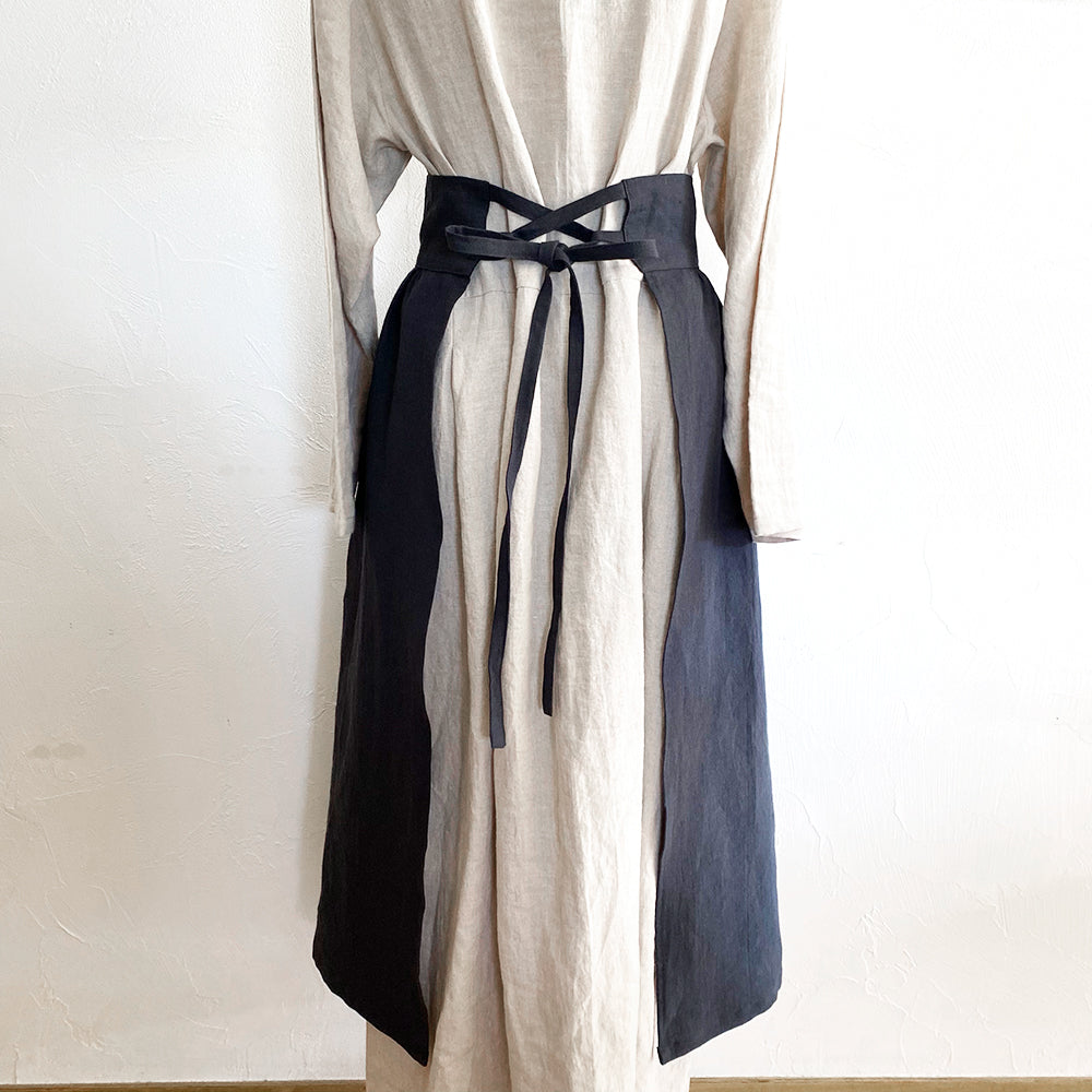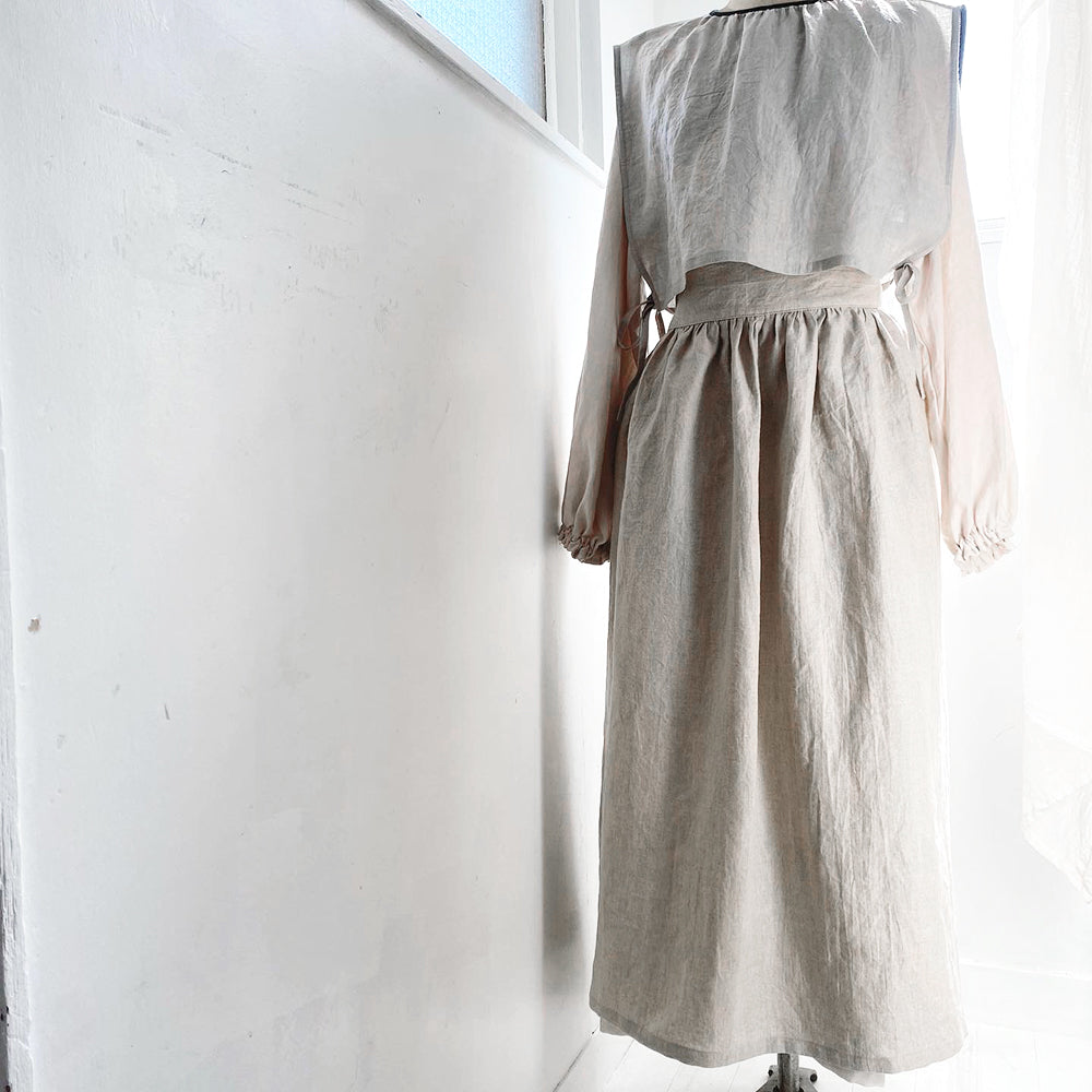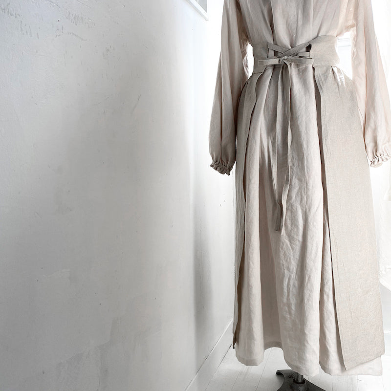 ワンピースにもう一枚重ねて纏う、乙女心をくすぐるアイテム。胸下あたりでキュッと結び、後ろの編み上げ部分が着用時に心地良い安定感がでます。いつものアイテムにプラスして気分転換もいいですし、暖かい季節には上衣がいらないコーディネートに後ろ姿のリボンがとてもアクセントになると思います。【サイズ】 free size 総丈 85cm 横幅 59cm 身幅 34cm 【素材】 リネン100% 洗濯可