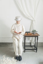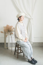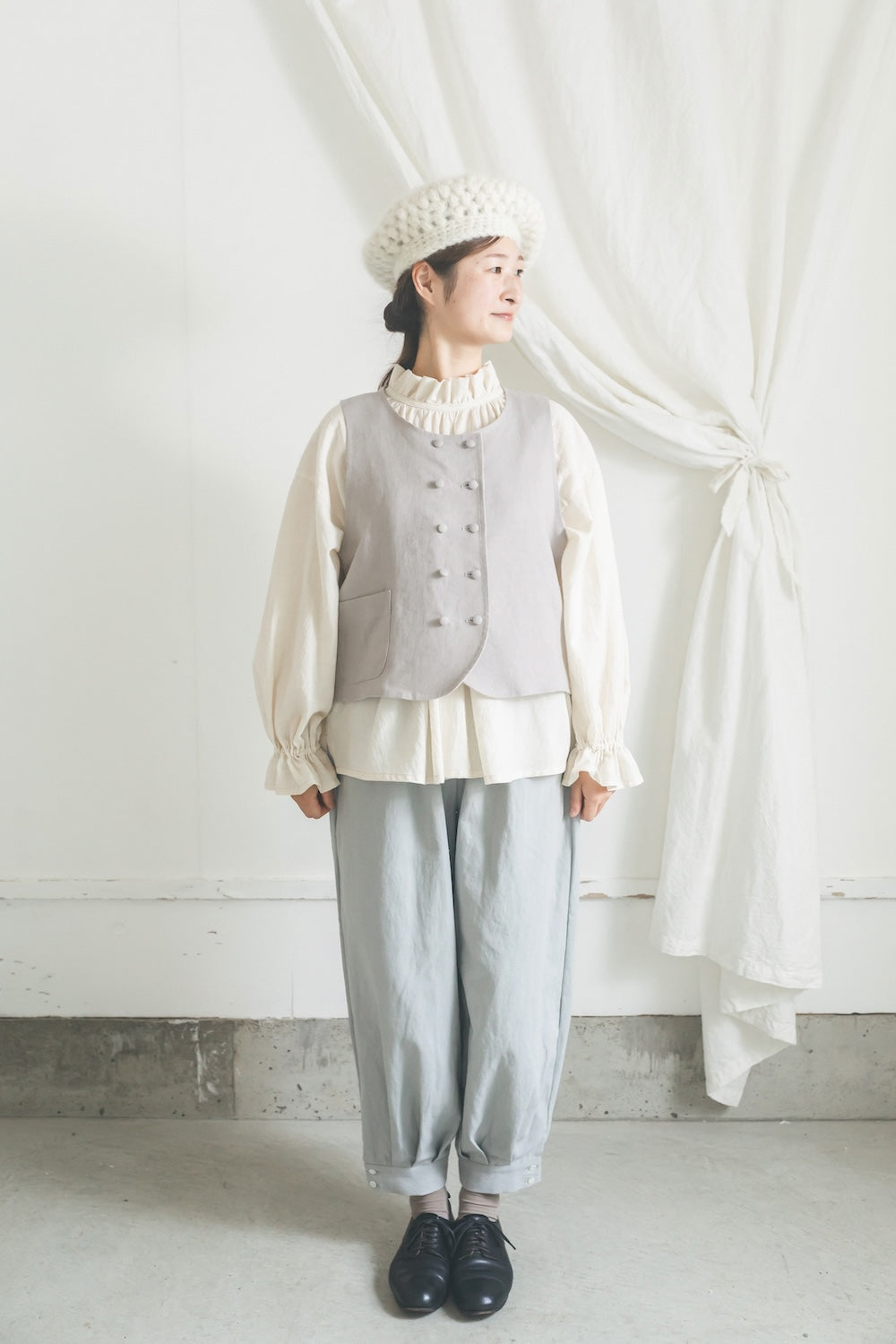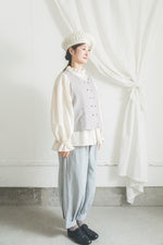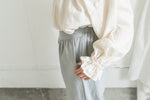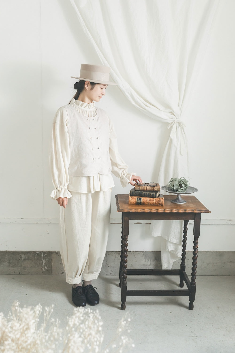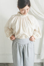 細かく入ったギャザーやパンツ裾部分のタックとボタンもアクセントに 両サイドにポケット付き