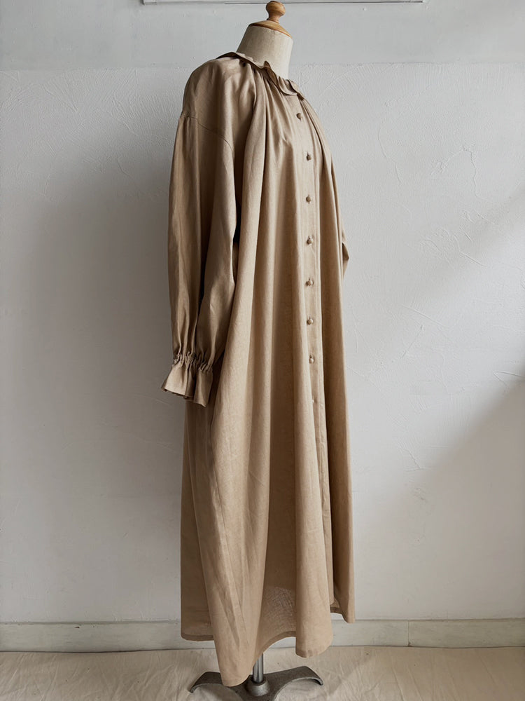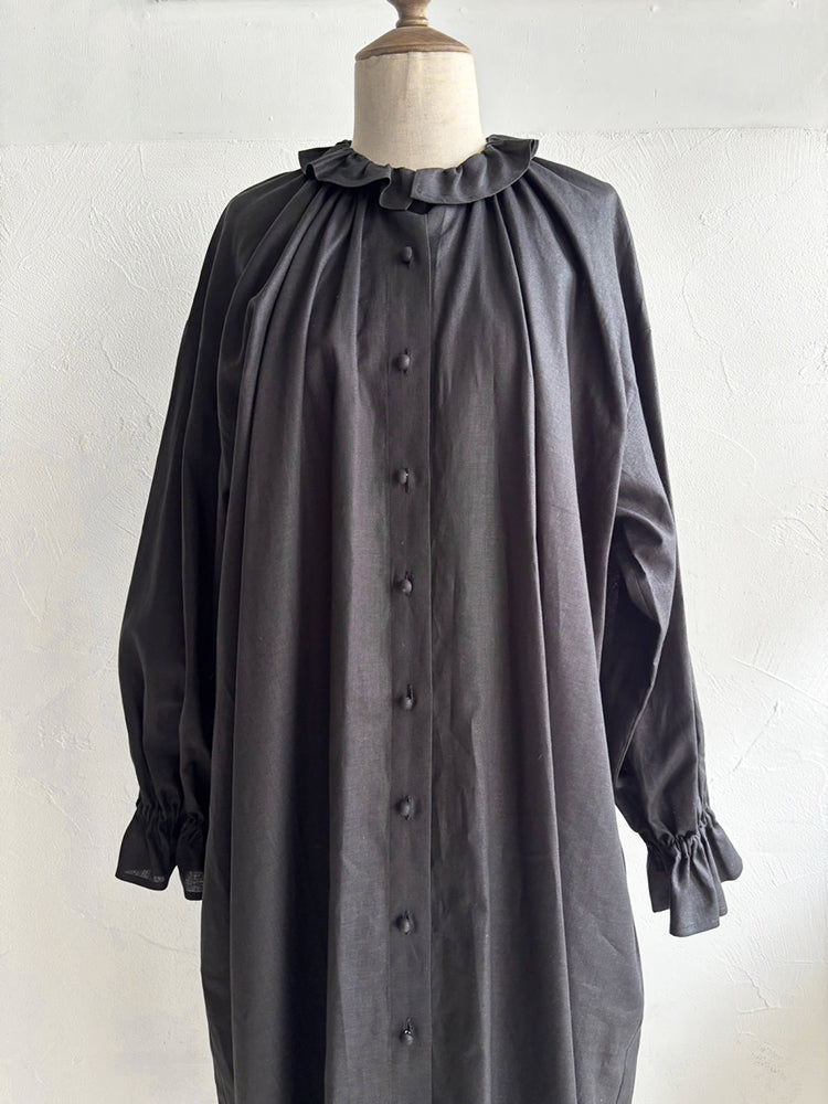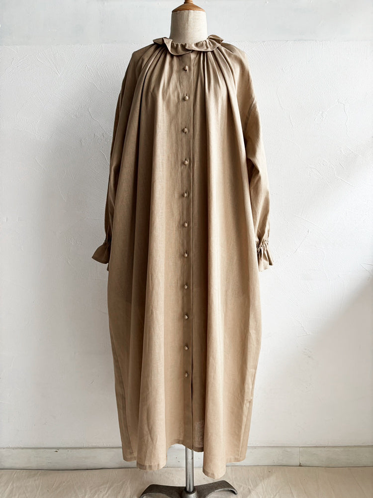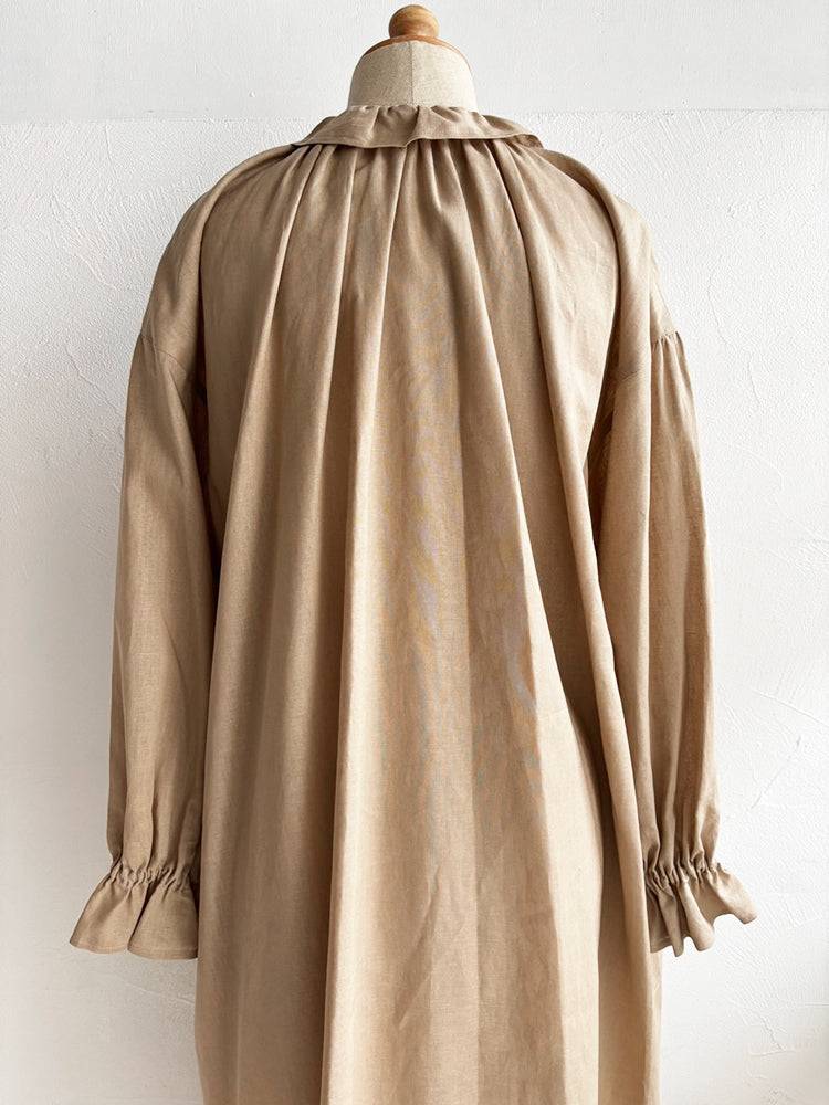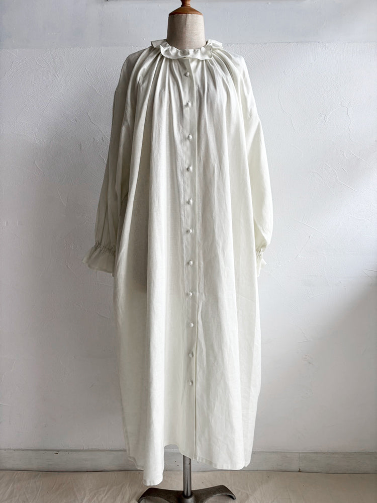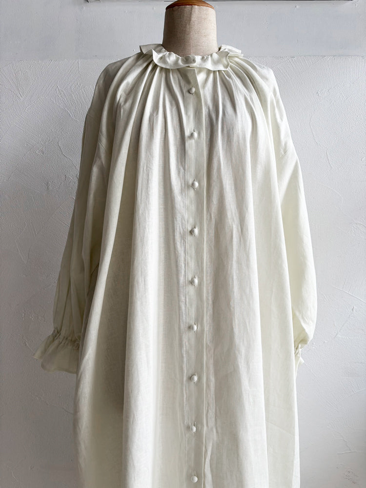 首元とお袖のフリルは花びらのイメージで、ポツポツ並んだ小さなくるみボタンも小さな蕾の様。首元から裾まで施したギャザーが華やかなシルエットです。ボタンを途中までとめて中のアイテムとの重ね着で別の表情が見えたり、羽織の様な着こなしも楽しめます。【サイズ】着丈120cm 前丈116cm  身幅73cm 裄丈 54cm モデル身長163cm【素材】麻50% 綿50%