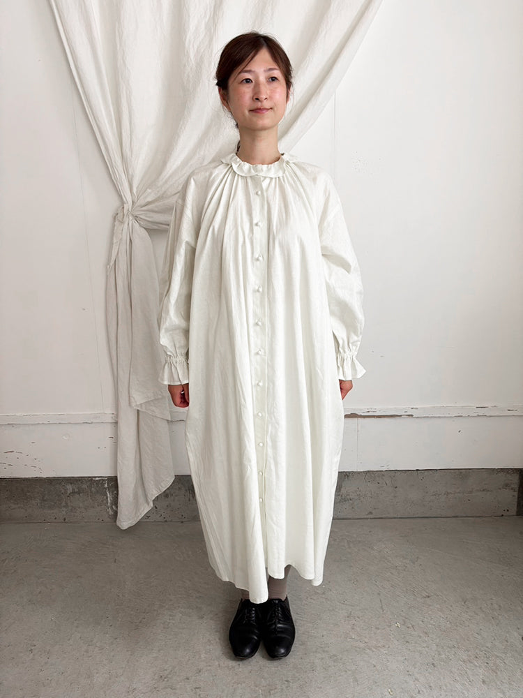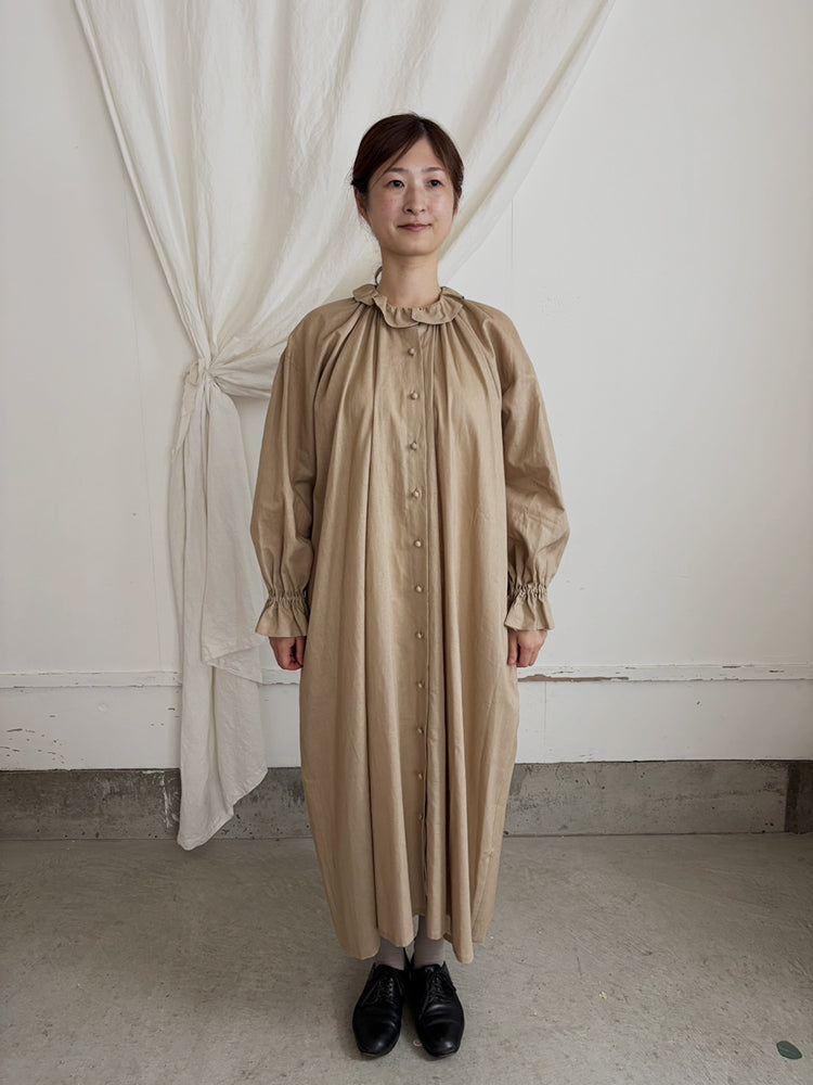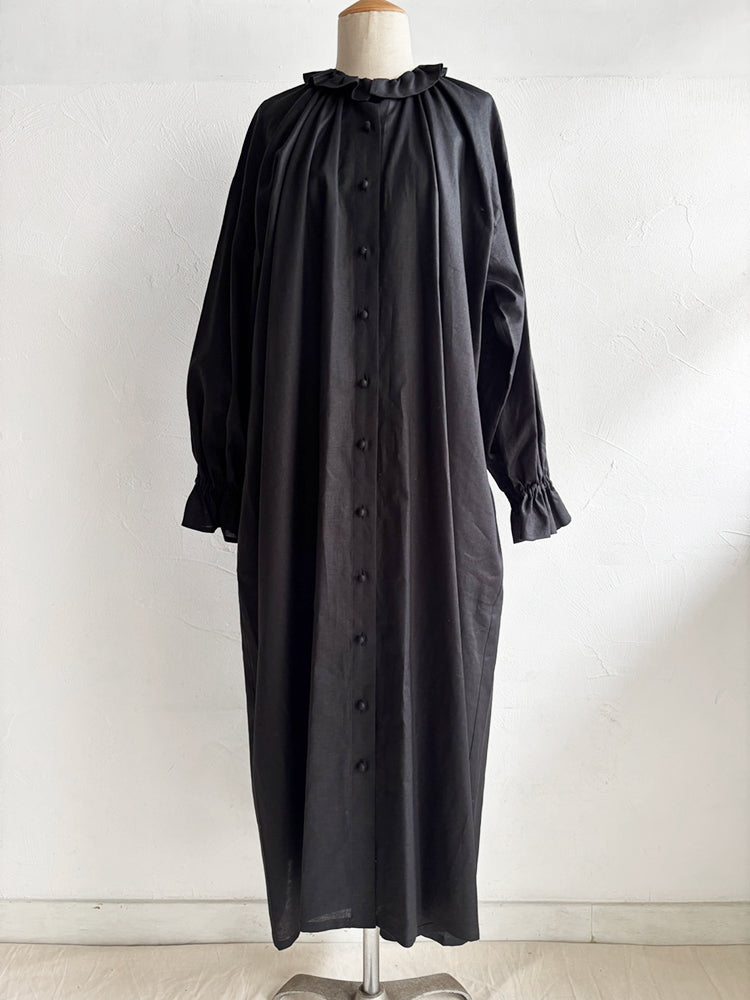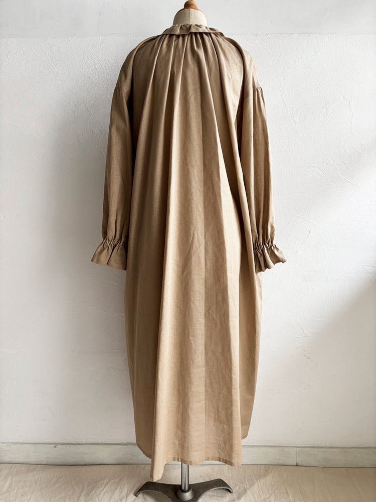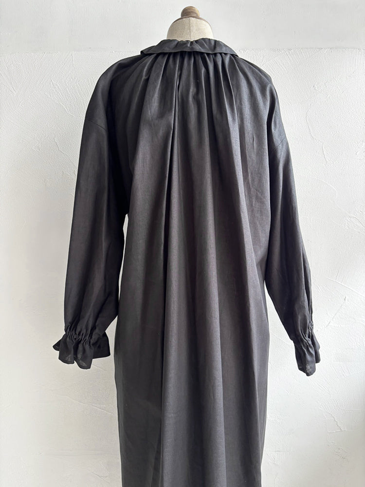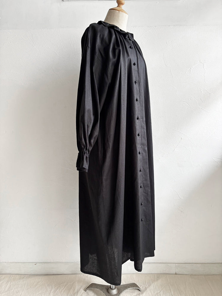 首元とお袖のフリルは花びらのイメージで、ポツポツ並んだ小さなくるみボタンも小さな蕾の様。首元から裾まで施したギャザーが華やかなシルエットです。ボタンを途中までとめて中のアイテムとの重ね着で別の表情が見えたり、羽織の様な着こなしも楽しめます。【サイズ】着丈120cm 前丈116cm  身幅73cm 裄丈 54cm モデル身長163cm【素材】麻50% 綿50%