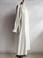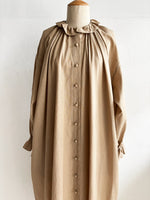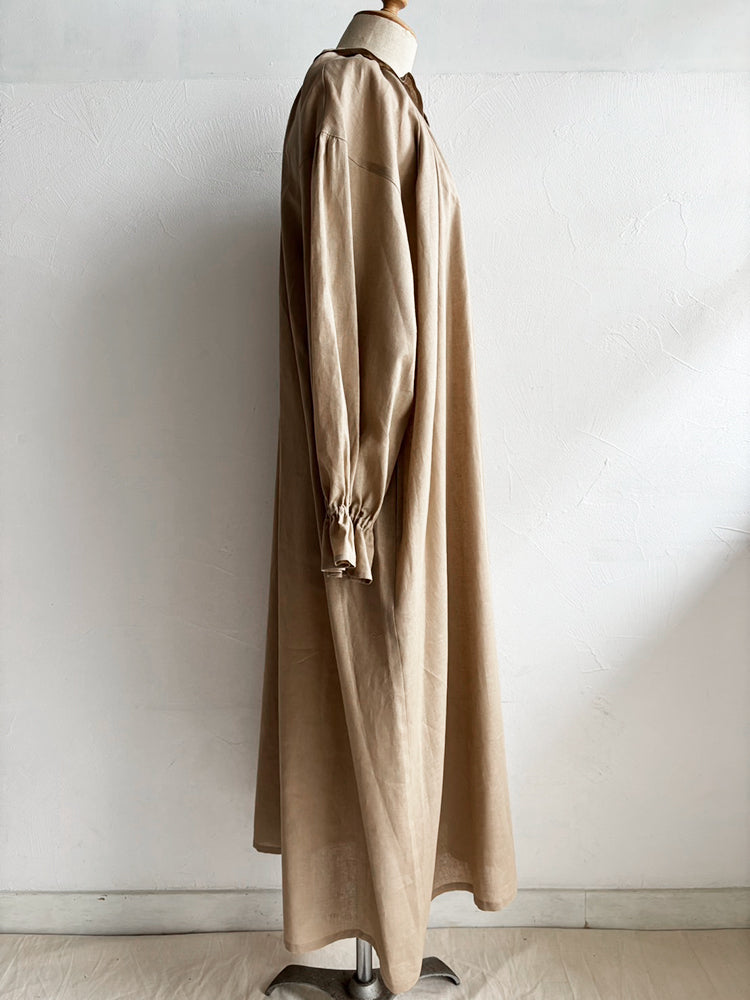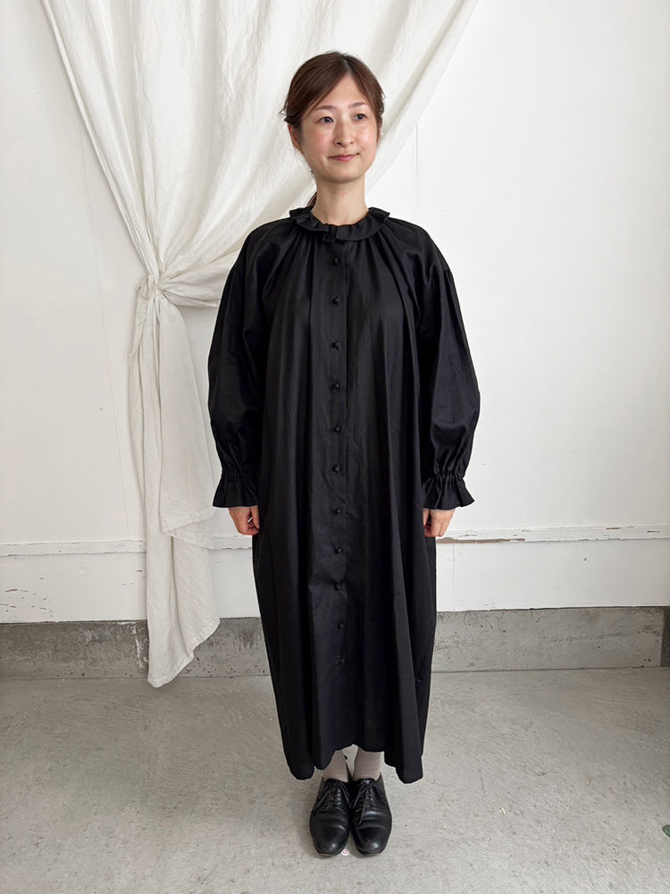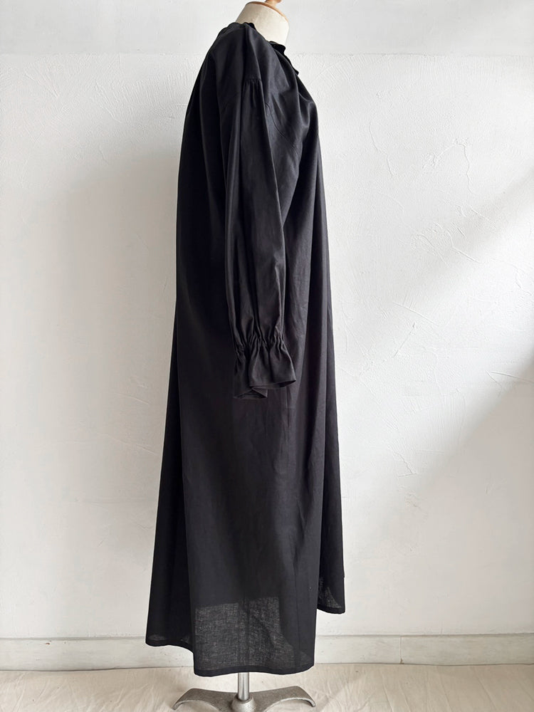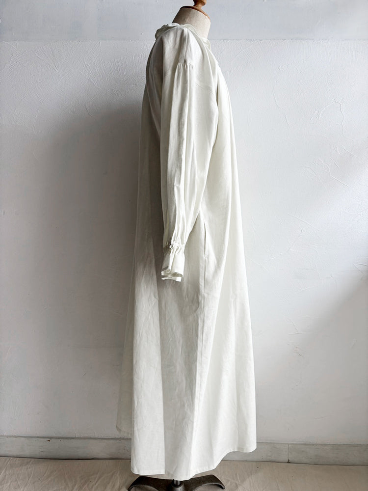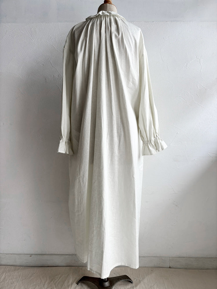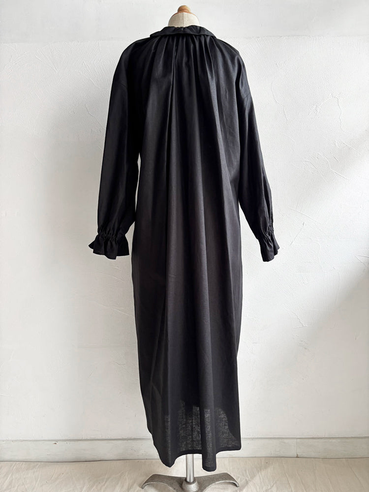 首元とお袖のフリルは花びらのイメージで、ポツポツ並んだ小さなくるみボタンも小さな蕾の様。首元から裾まで施したギャザーが華やかなシルエットです。ボタンを途中までとめて中のアイテムとの重ね着で別の表情が見えたり、羽織の様な着こなしも楽しめます。【サイズ】着丈120cm 前丈116cm  身幅73cm 裄丈 54cm モデル身長163cm【素材】麻50% 綿50%