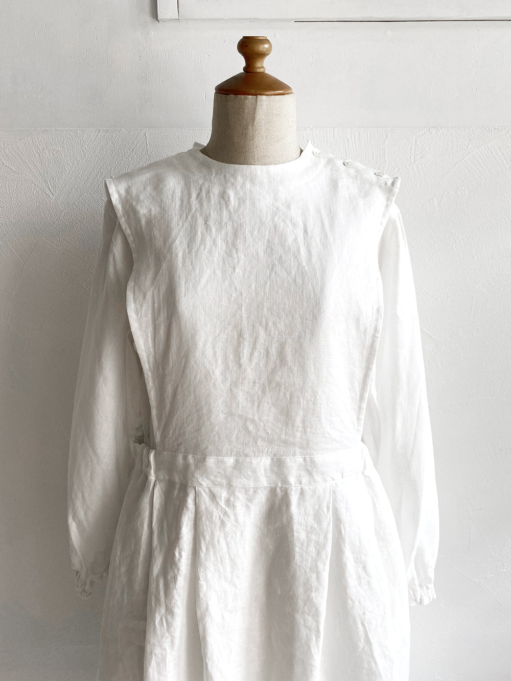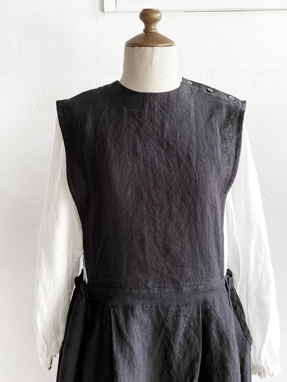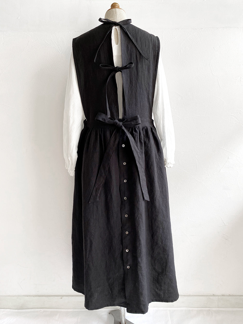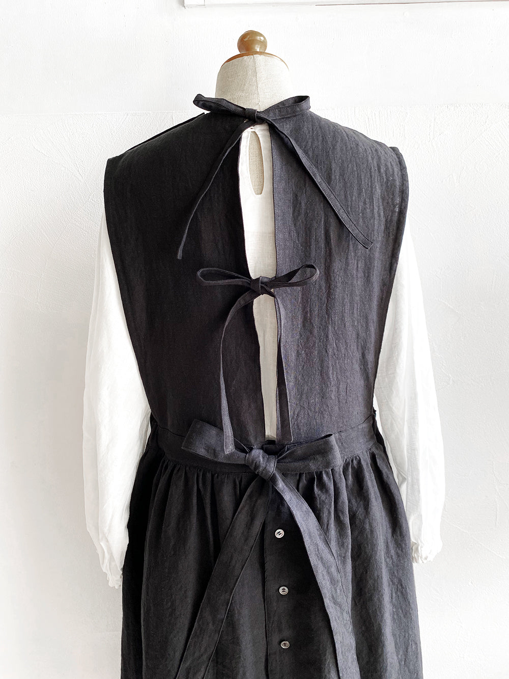 後ろにお行儀よく並んだ3つのリボンが印象的。遠い昔の女の子達が着るときに結びっこする絵がイメージできます。リボン結びを縦にならないように、とびきり可愛く結べるように。左肩に付いたボタンは開閉できるので切る前に結び整えてからかぶって着ることができます。後ろの腰から下の貝ボタンも開けられるのでコーディネートによっては途中まで開けたり全開にして中のスカートなど見せてくるのもかわいいです。首周り詰まり具合いや胸あてラインもきりりと、クラシカルな雰囲気。