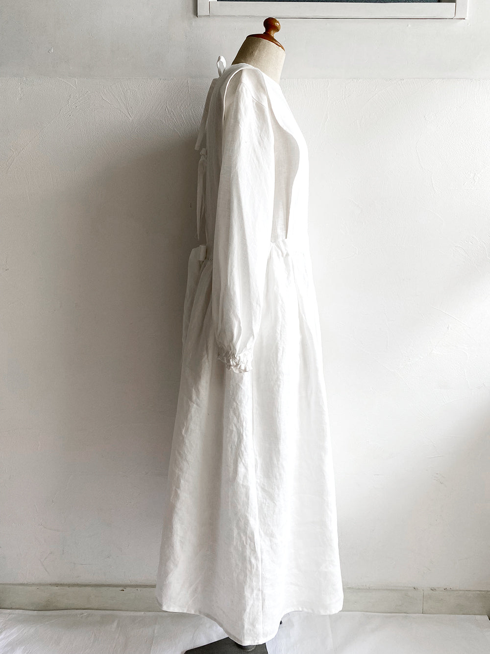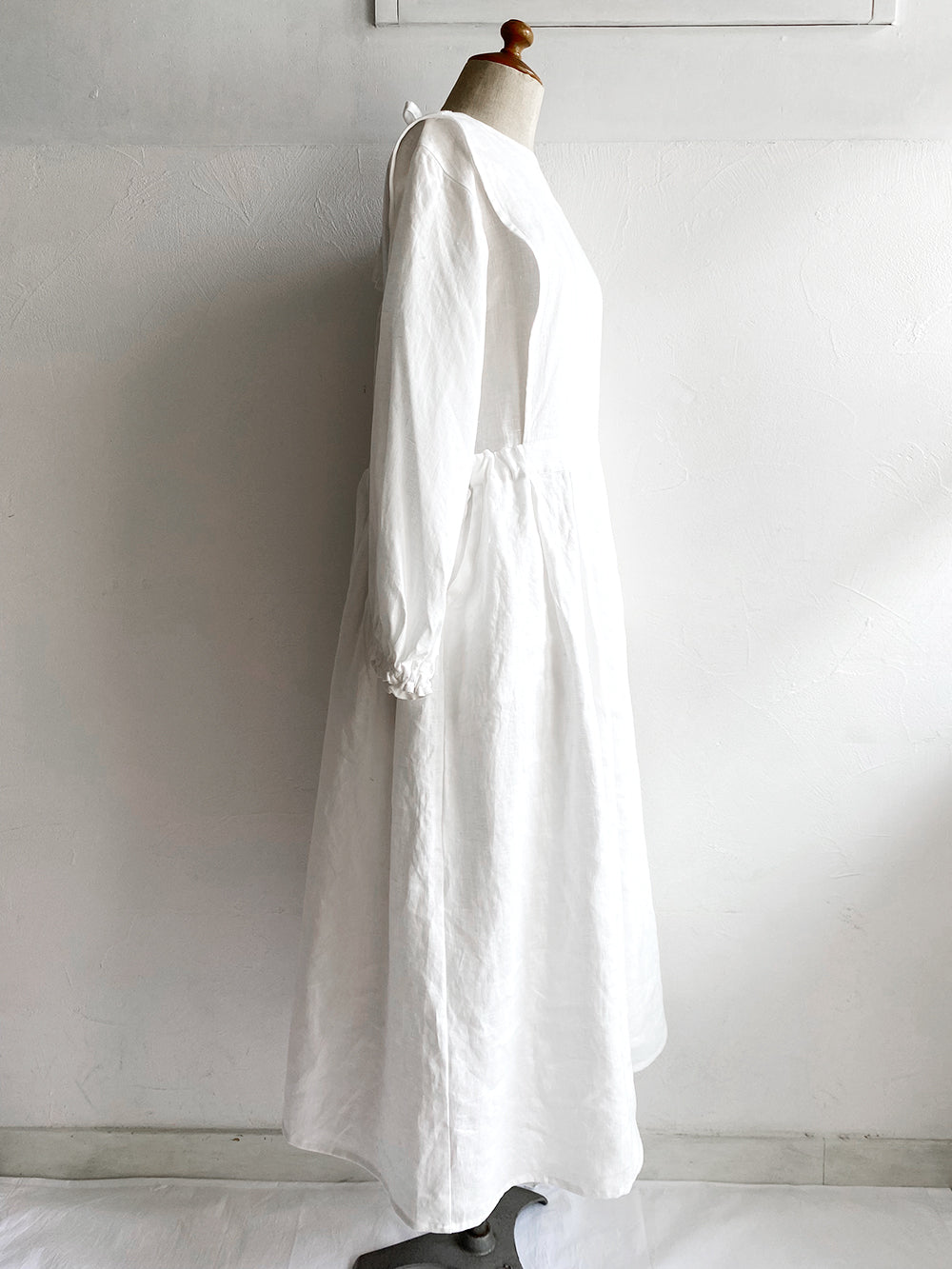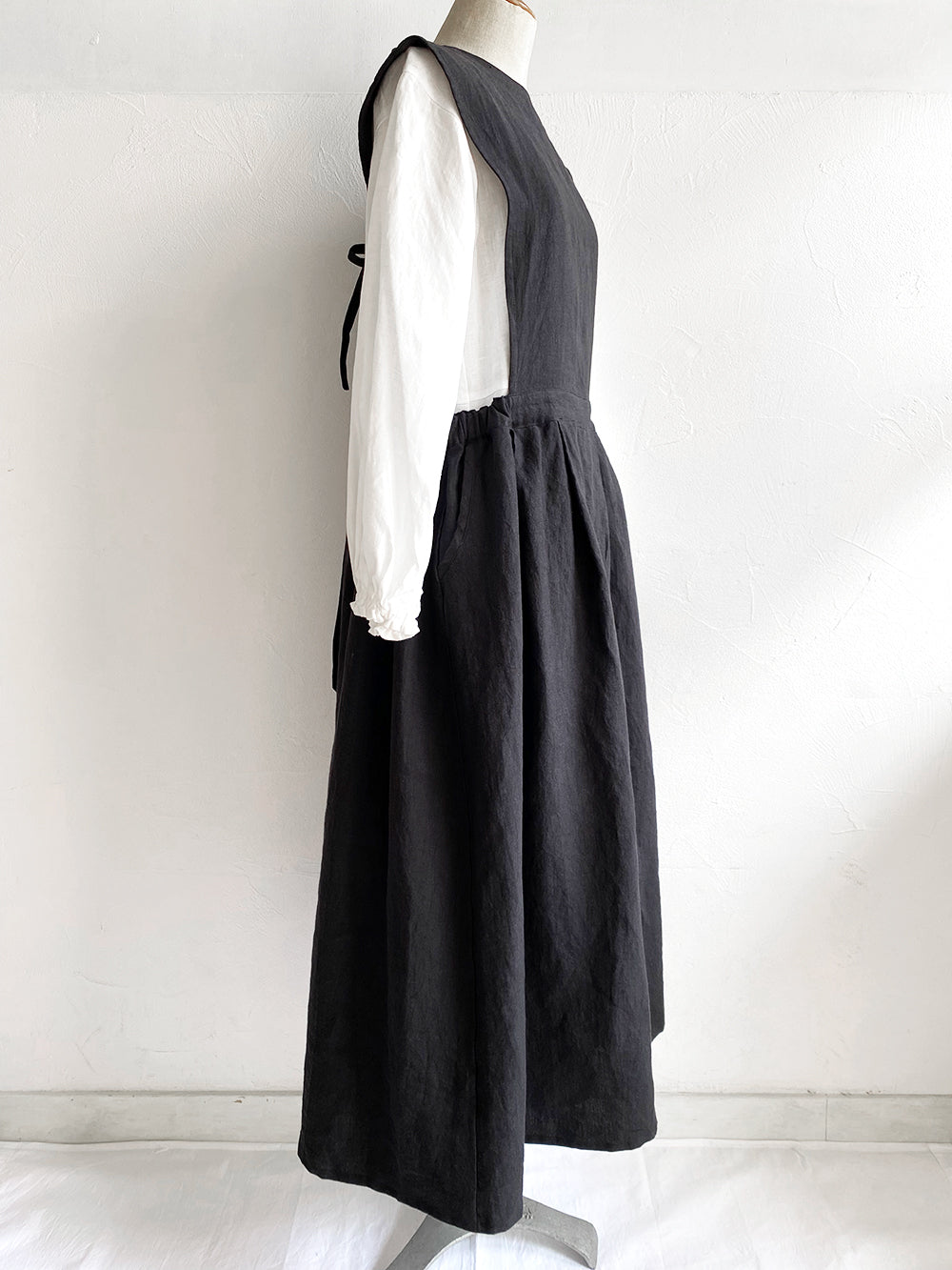 後ろにお行儀よく並んだ3つのリボンが印象的。遠い昔の女の子達が着るときに結びっこする絵がイメージできます。リボン結びを縦にならないように、とびきり可愛く結べるように。左肩に付いたボタンは開閉できるので切る前に結び整えてからかぶって着ることができます。後ろの腰から下の貝ボタンも開けられるのでコーディネートによっては途中まで開けたり全開にして中のスカートなど見せてくるのもかわいいです。首周り詰まり具合いや胸あてラインもきりりと、クラシカルな雰囲気。