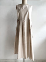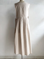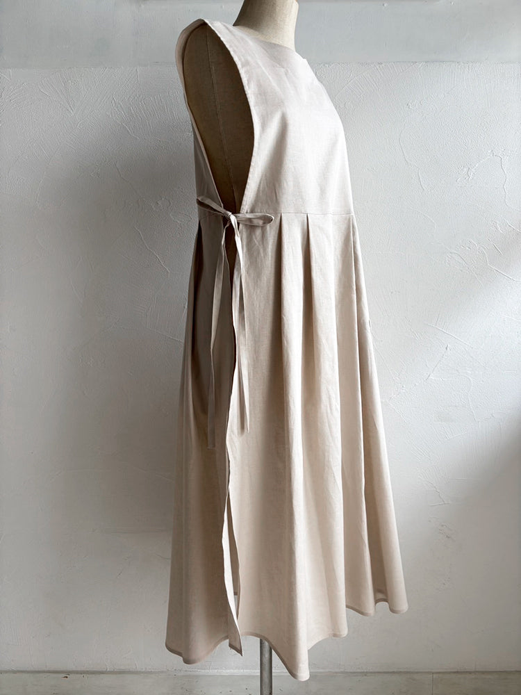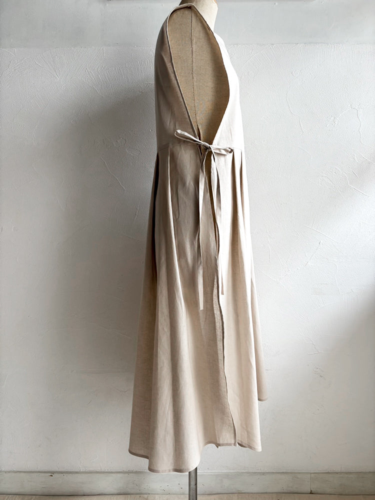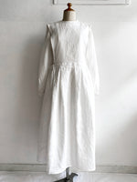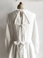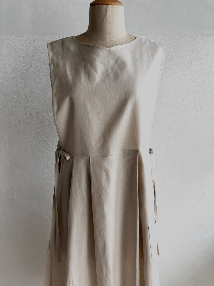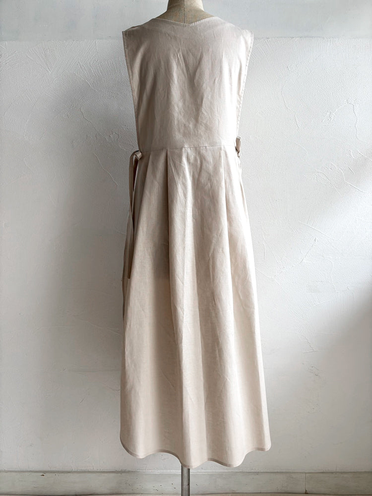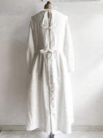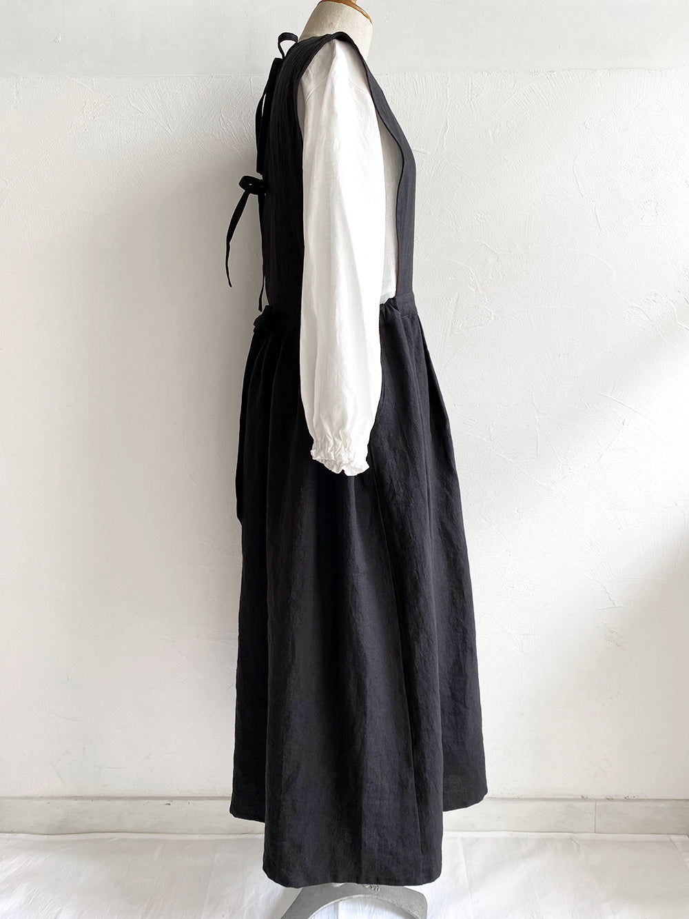 後ろにお行儀よく並んだ3つのリボンが印象的。遠い昔の女の子達が着るときに結びっこする絵がイメージできます。リボン結びを縦にならないように、とびきり可愛く結べるように。左肩に付いたボタンは開閉できるので切る前に結び整えてからかぶって着ることができます。後ろの腰から下の貝ボタンも開けられるのでコーディネートによっては途中まで開けたり全開にして中のスカートなど見せてくるのもかわいいです。首周り詰まり具合いや胸あてラインもきりりと、クラシカルな雰囲気。