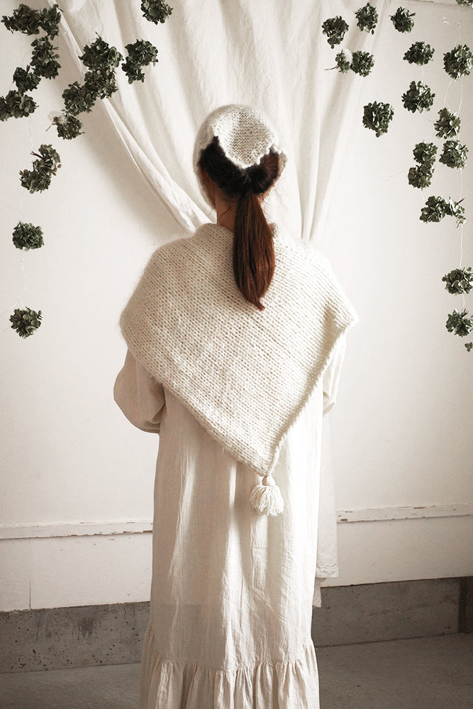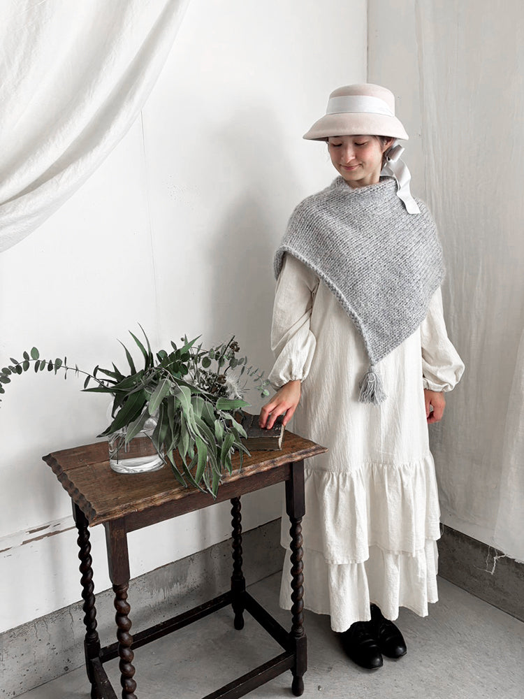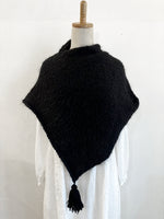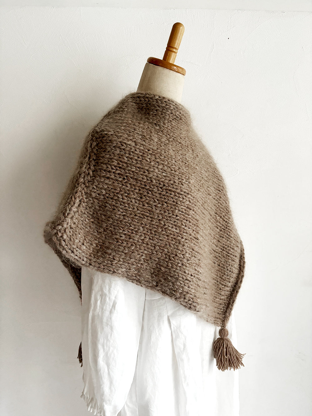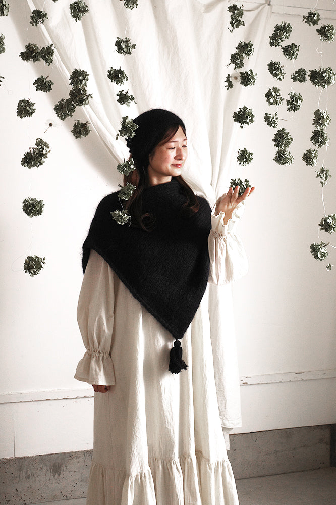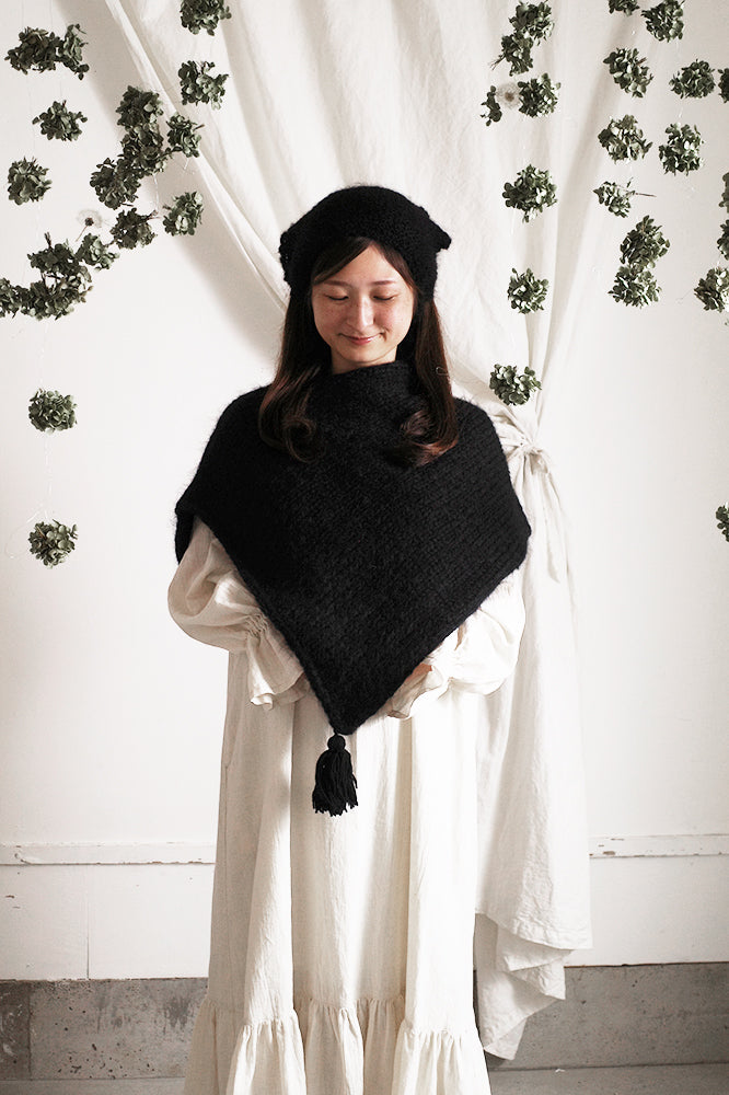 ニットポンチョ 上質な素材を用いで丁寧に編み込まれたニットポンチョです。暖かさはもちろん優しい風合いが体を包んでくれてとても居心地が良い一着です。三角形のフォルムと優しい印象、そして先っぽの大きなタッセルがとっても可愛い、冬には一枚持っていたくなるポンチョ。寒さをかわいくあたたかく乗りきる相棒になってくれます。ワンピースやコートの上からふわっと被ってお出かけを楽しんでくださいね。