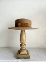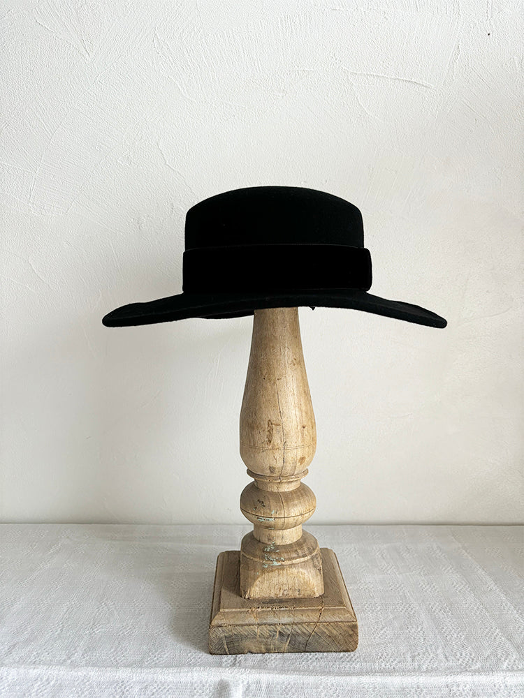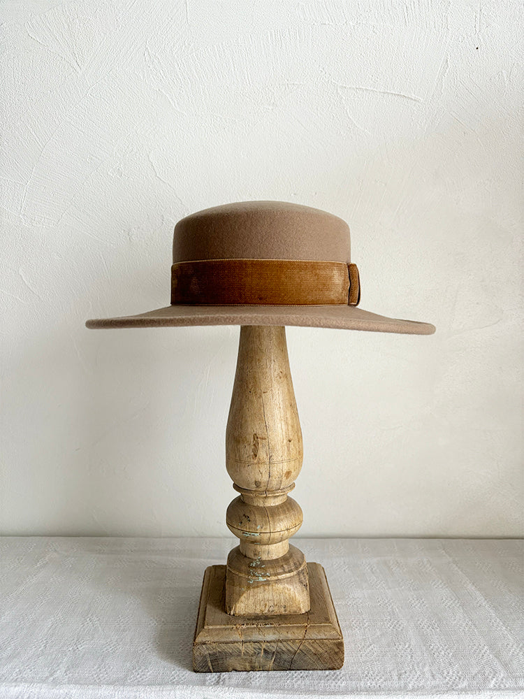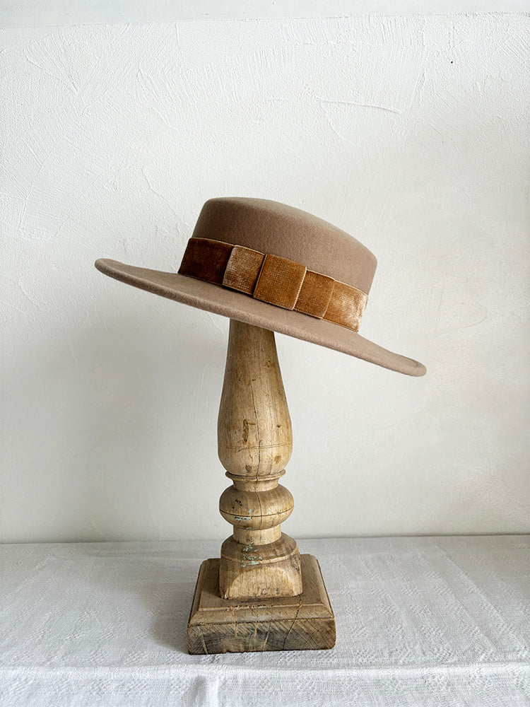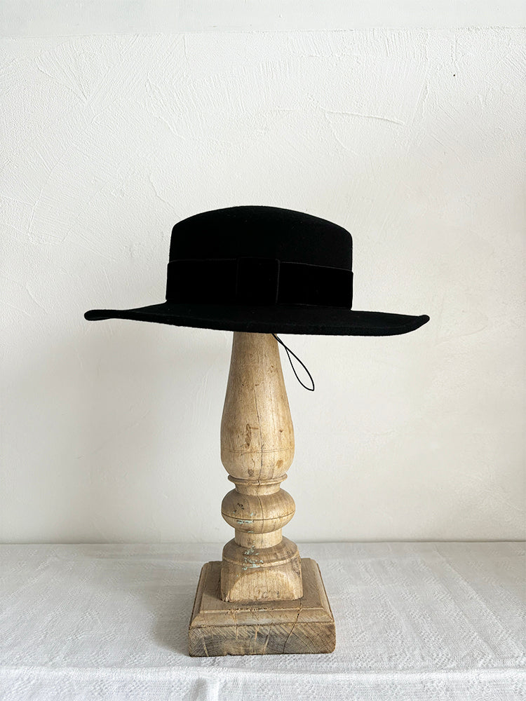 マニッシュなカンカン帽のデザインに贅沢なペルベット素材のリボン飾りを仕様した上品な帽子です。糊入れ加工をせずに柔らかさのある仕上がりです。素材】帽体 ウール100% 【サイズ】頭囲 55cm〜58cm