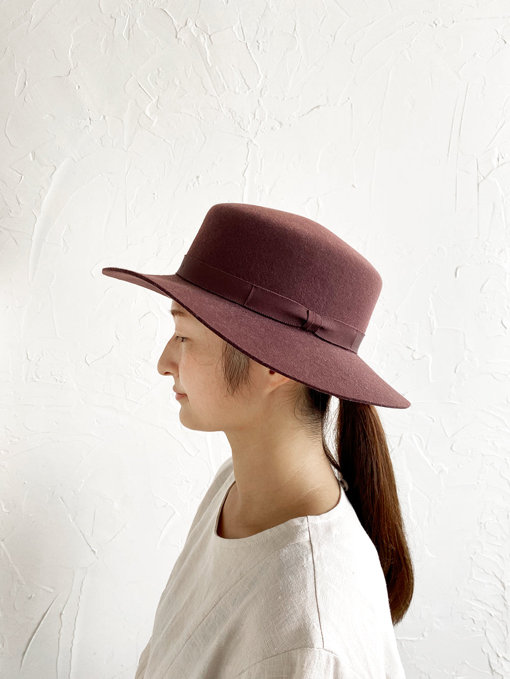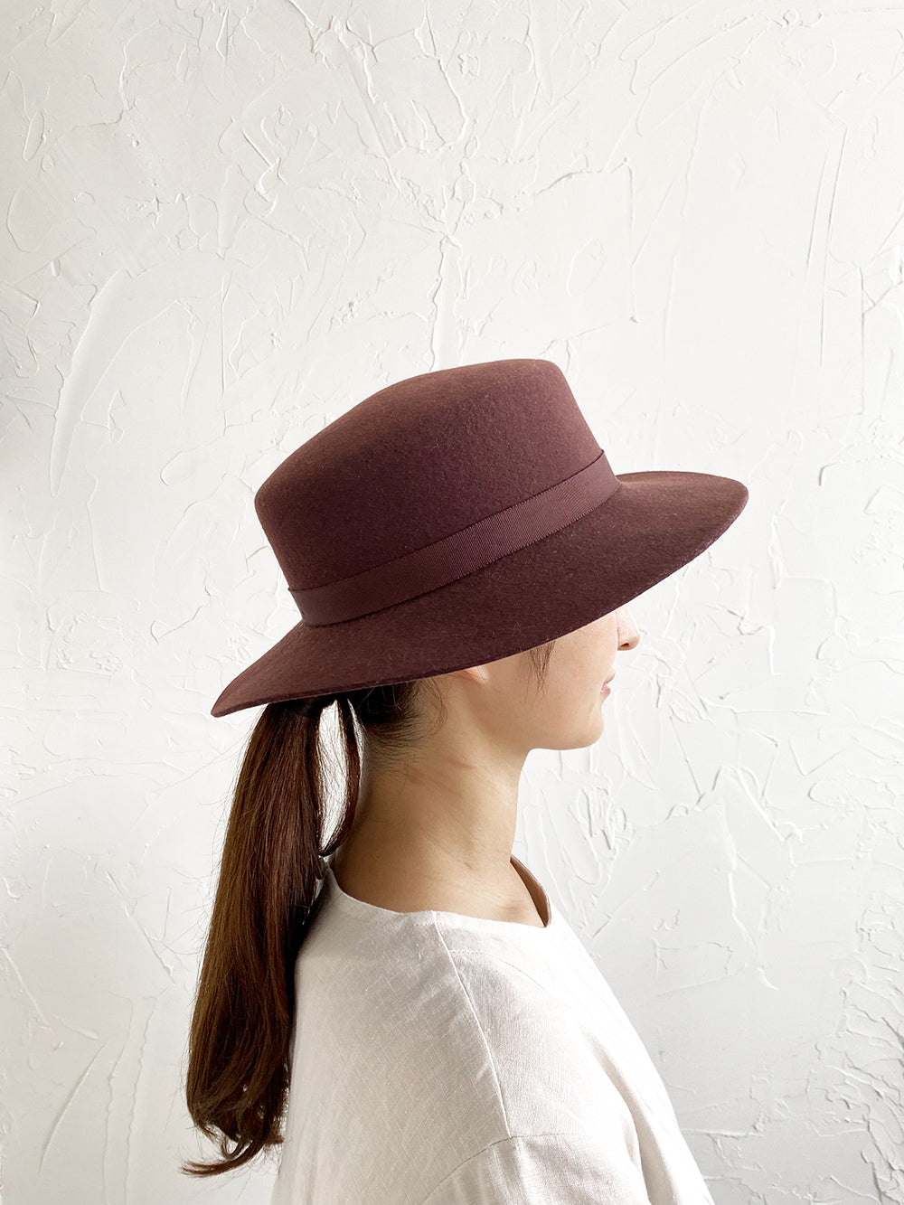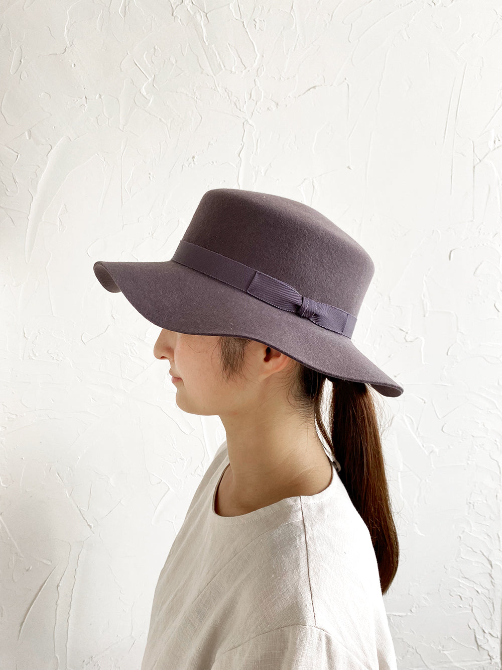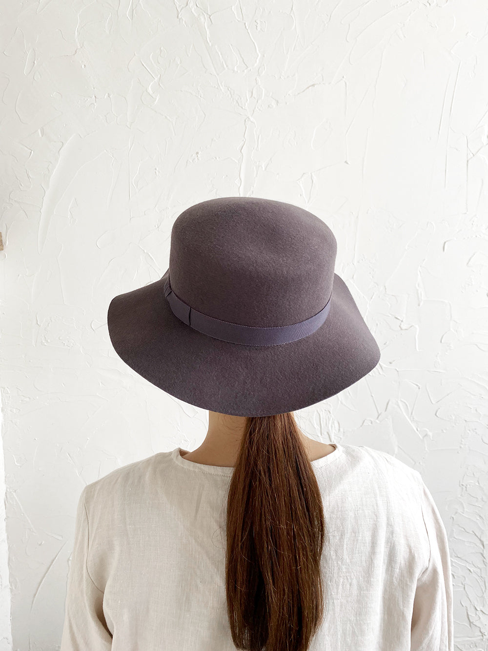 やさしいフォルムで女性らしい丸みがかったトップと下がり気味のブリムがさわやかにかわいい帽子。ウールの素材が優しい雰囲気を引き立ててくれます。付属の黒ゴムを後頭部に回して止めると帽子が安定し風に飛ばされにくくなります。【サイズ】 頭囲 55cm〜58cm 8cm 帽子の高さ つばの広さ 7cm 【素材】 ウール