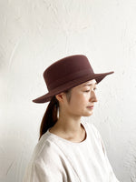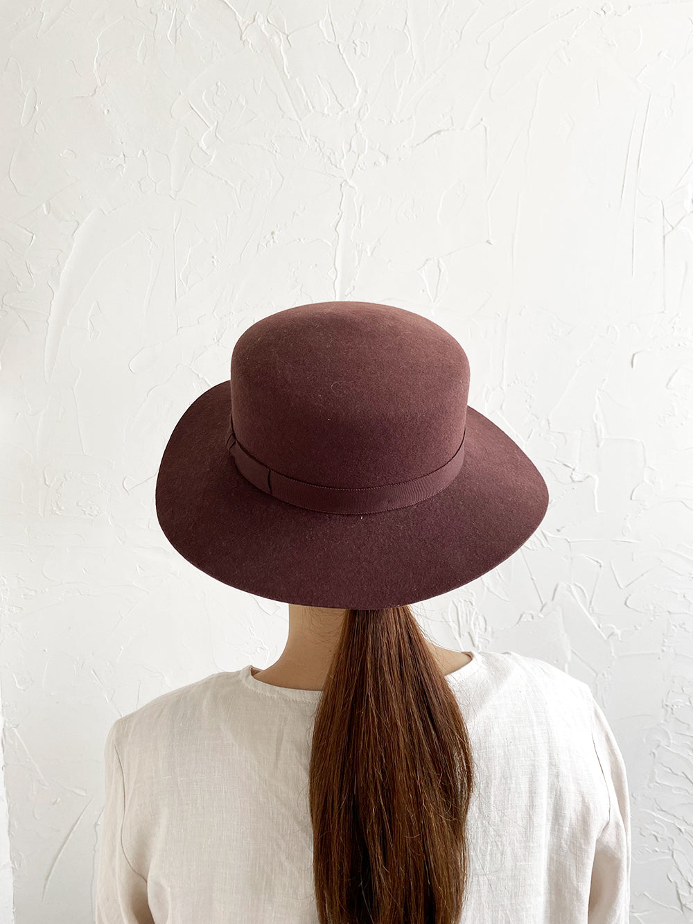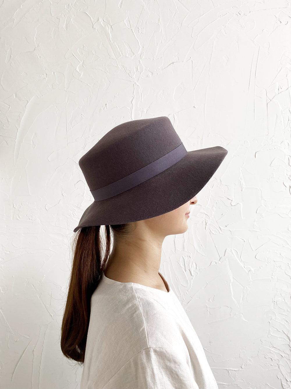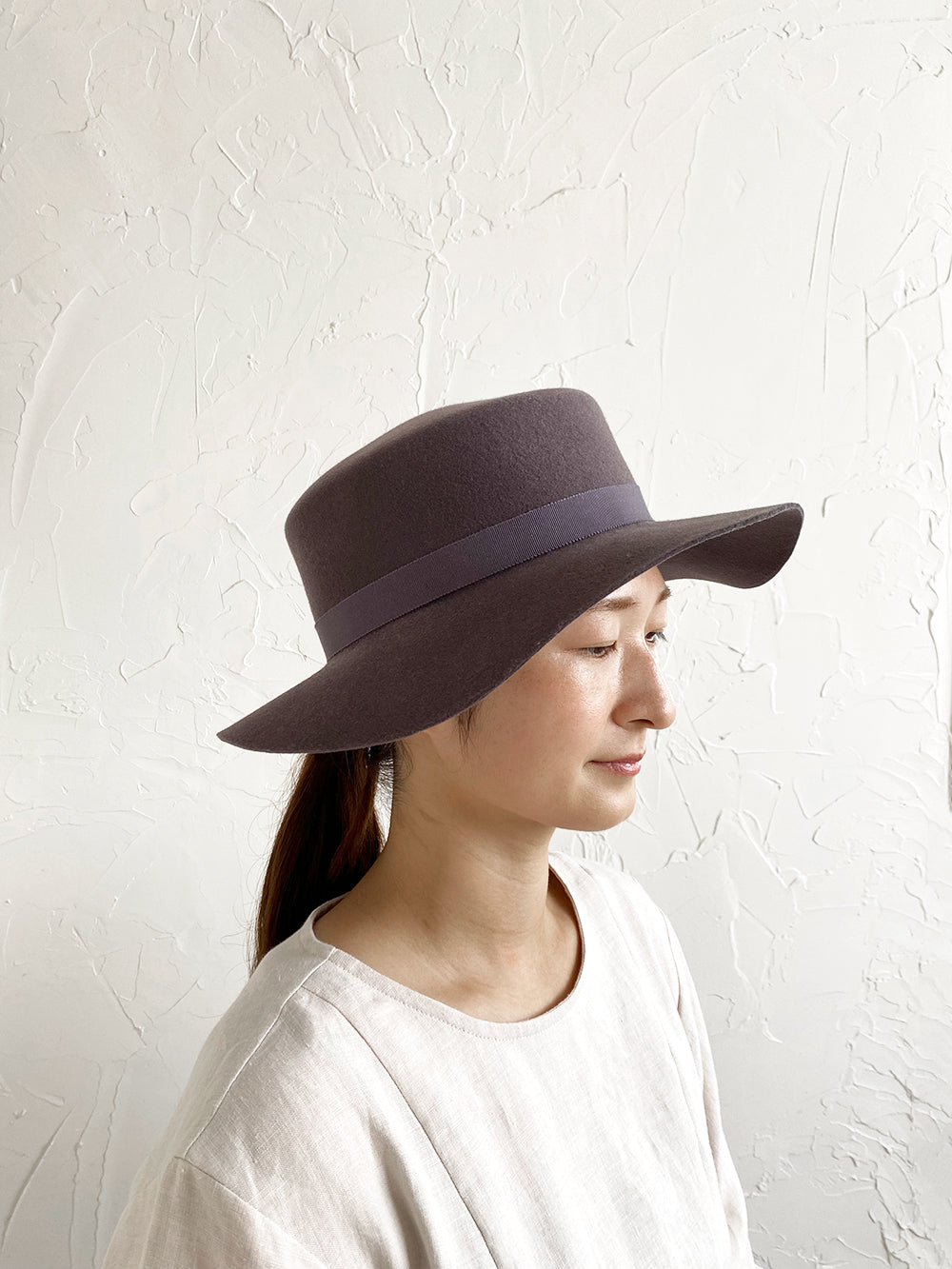 やさしいフォルムで女性らしい丸みがかったトップと下がり気味のブリムがさわやかにかわいい帽子。ウールの素材が優しい雰囲気を引き立ててくれます。付属の黒ゴムを後頭部に回して止めると帽子が安定し風に飛ばされにくくなります。【サイズ】 頭囲 55cm〜58cm 8cm 帽子の高さ つばの広さ 7cm 【素材】 ウール