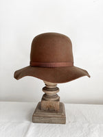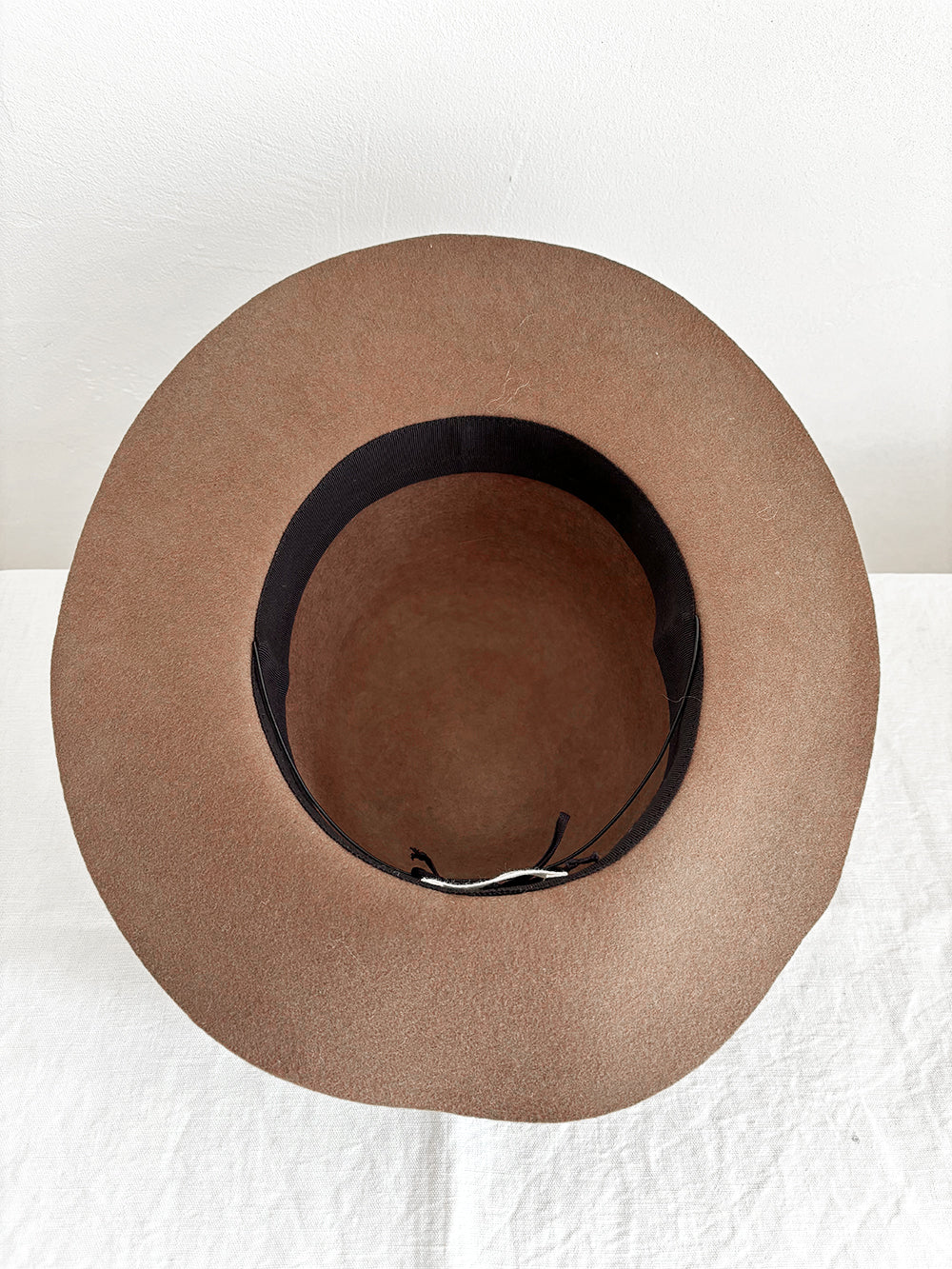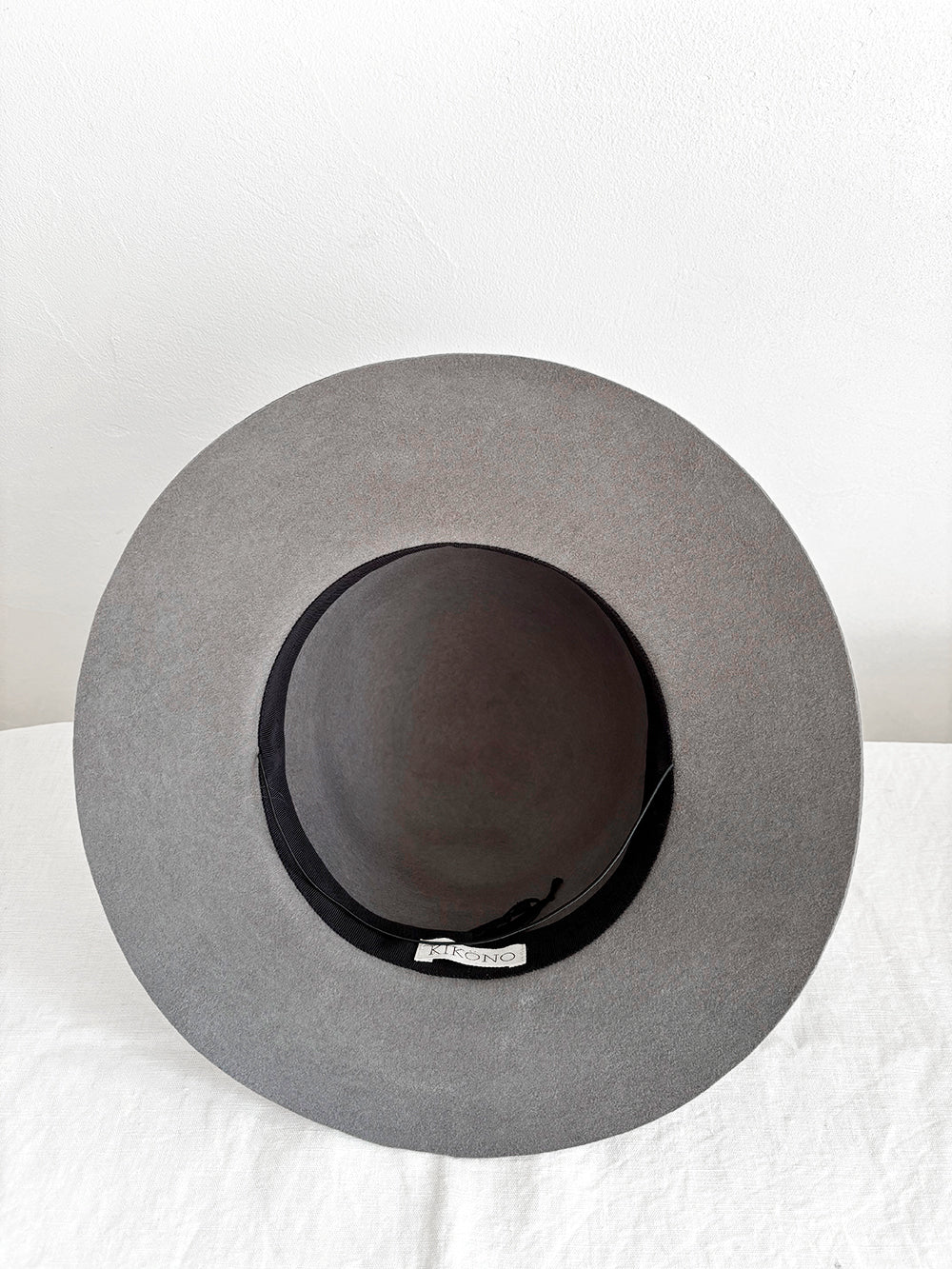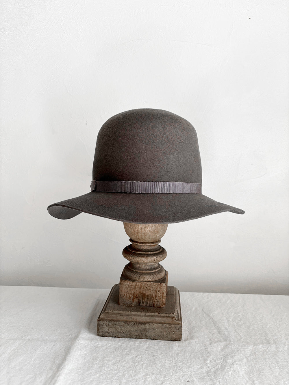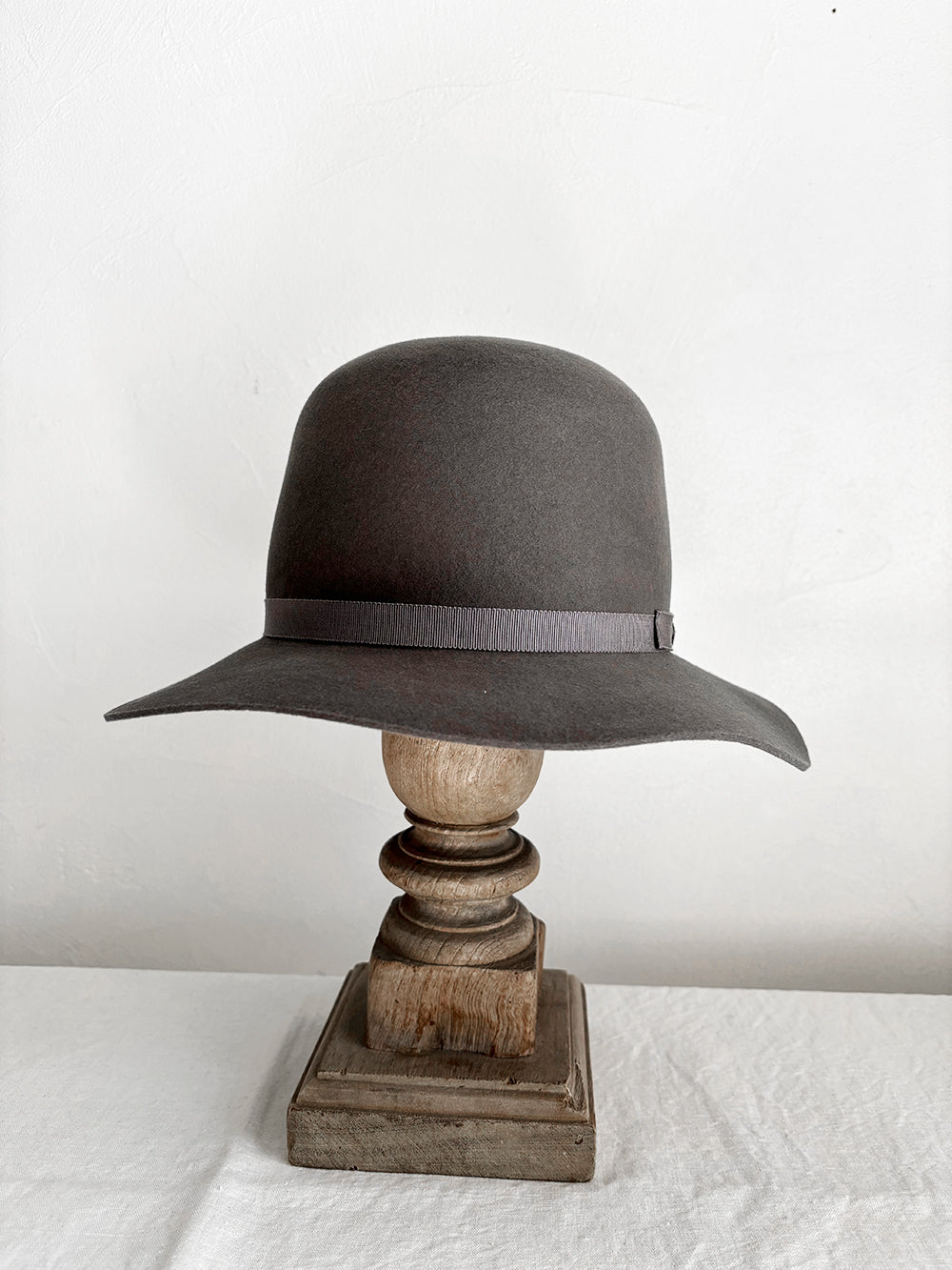 高さのあるクラウンが個性的な印象の帽子です。スタイリッシュなスタイルですのでユニセックスでお使いいただけます。 お色はキャメル、グレー、黒の3色展開。 頭囲 56cm〜59cm 高さ13cm ブリム幅7cm