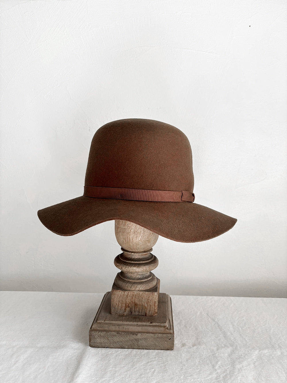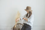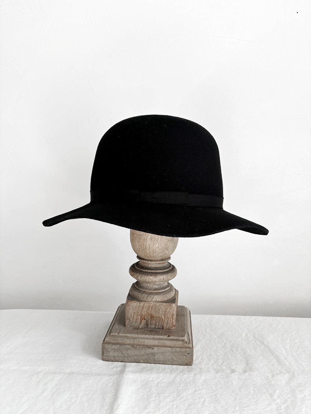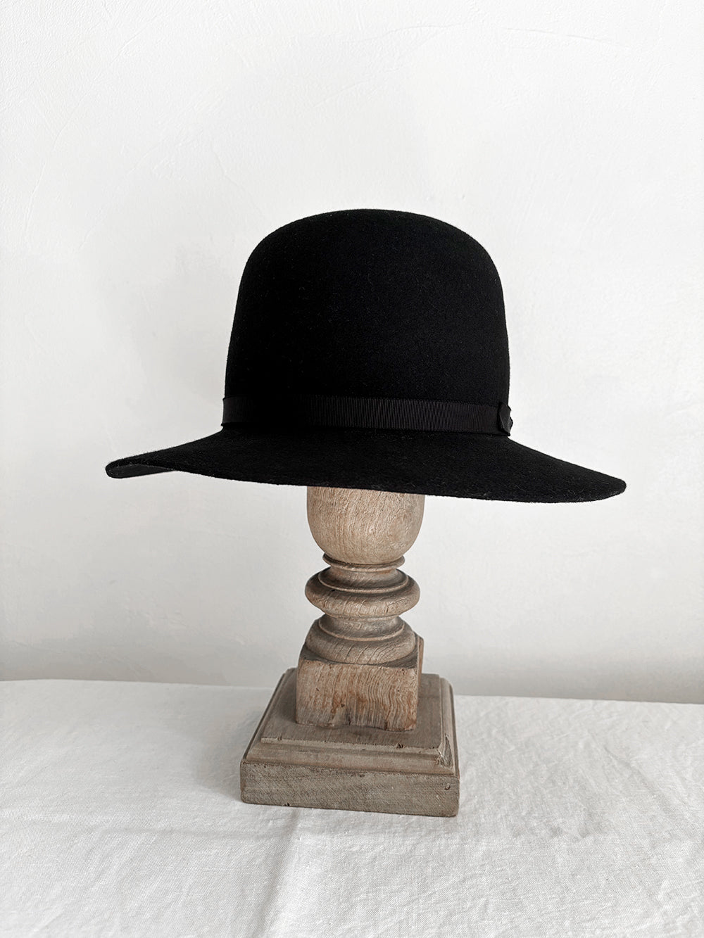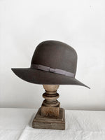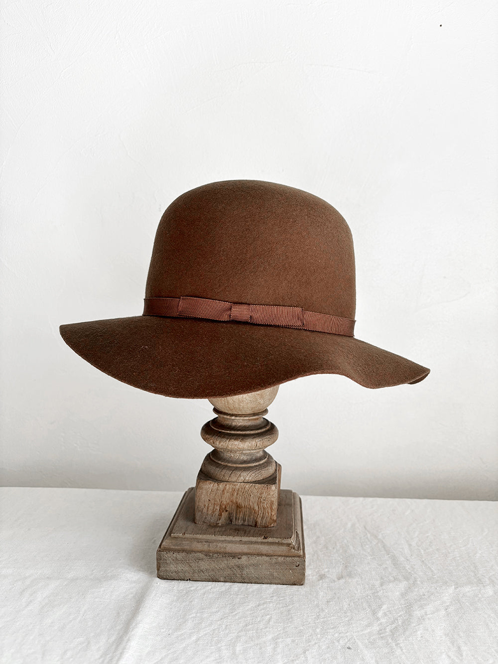 高さのあるクラウンが個性的な印象の帽子です。スタイリッシュなスタイルですのでユニセックスでお使いいただけます。 お色はキャメル、グレー、黒の3色展開。 頭囲 56cm〜59cm 高さ13cm ブリム幅7cm
