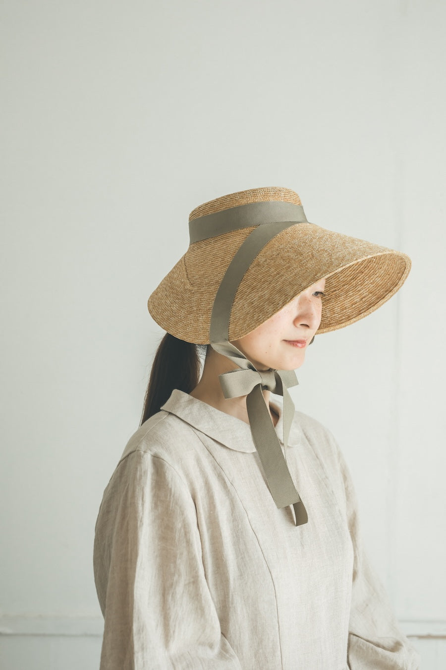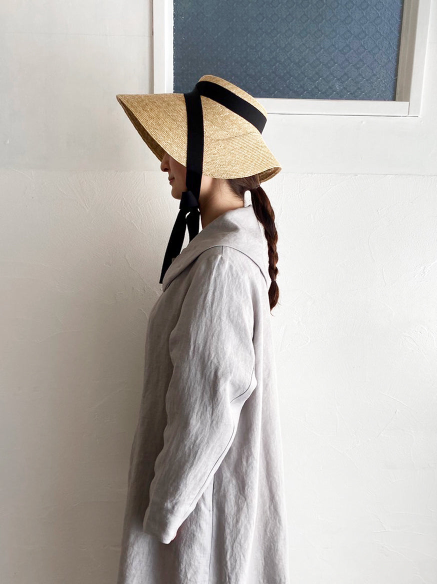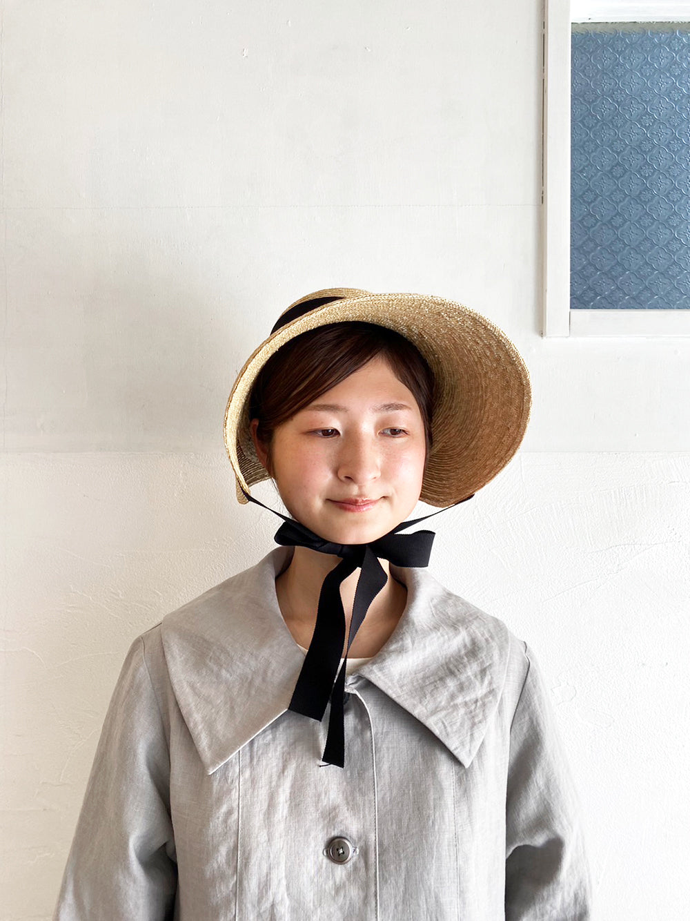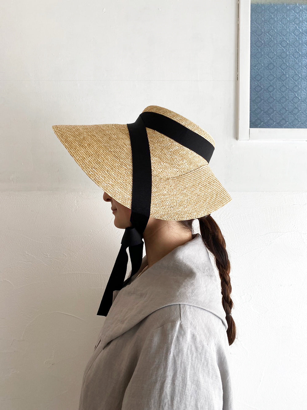 ヨーロッパの古い映画に出てくるようなボンネット型の帽子。人気のJaneやHannahのデザインをよりつば広に仕立てました。高級感がありエレガントな雰囲気に。細い麦ブレードの素材感がよりアンティークの雰囲気を醸し出しています。リボンは後ろで結んだり横で結んだりとアレンジを楽しんでみてください。付属の黒ゴムを後頭部に回して止めると帽子が安定し風に飛ばされにくくなります。【サイズ】 free 【素材】 麦