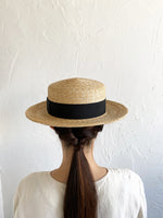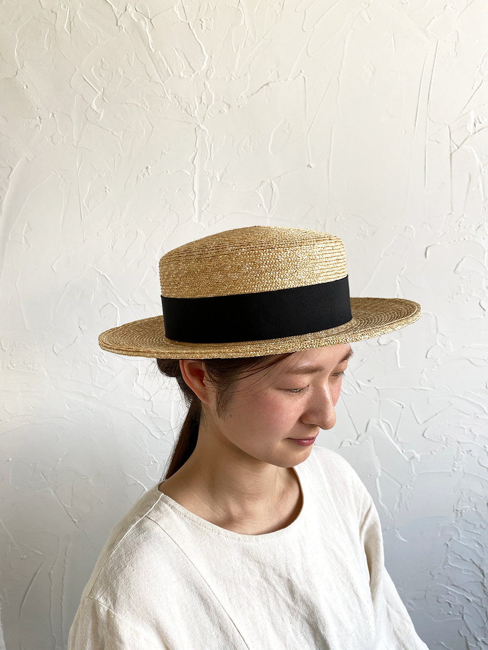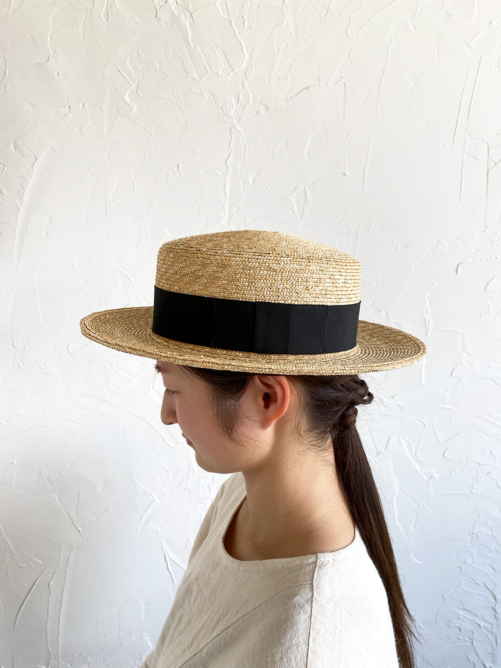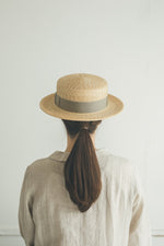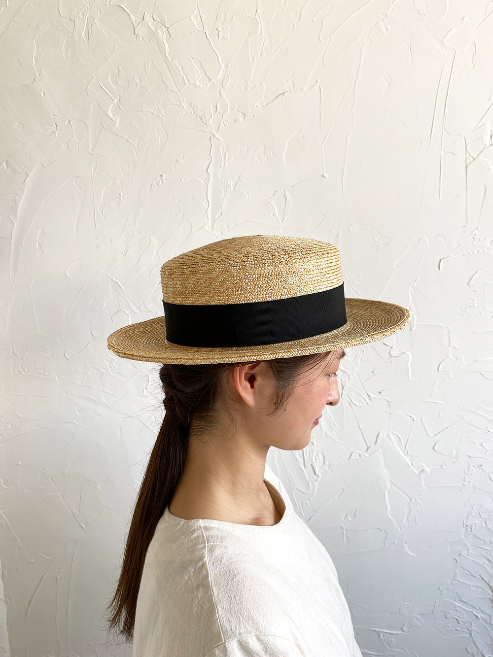 浅いながらも安定感のあるクラシカルな帽子。極細の麦ブレードを使用して丁寧に作られた帽子、被るその姿はとても美しいです。付属の黒ゴムを後頭部に回して止めると帽子が安定し風に飛ばされにくくなります。内側には絞ることでサイズ調整できる仕様です。【サイズ】 頭囲 55cm〜58cm 帽子の高さ 8cm つばの広さ6.5cm 【素材】 麦