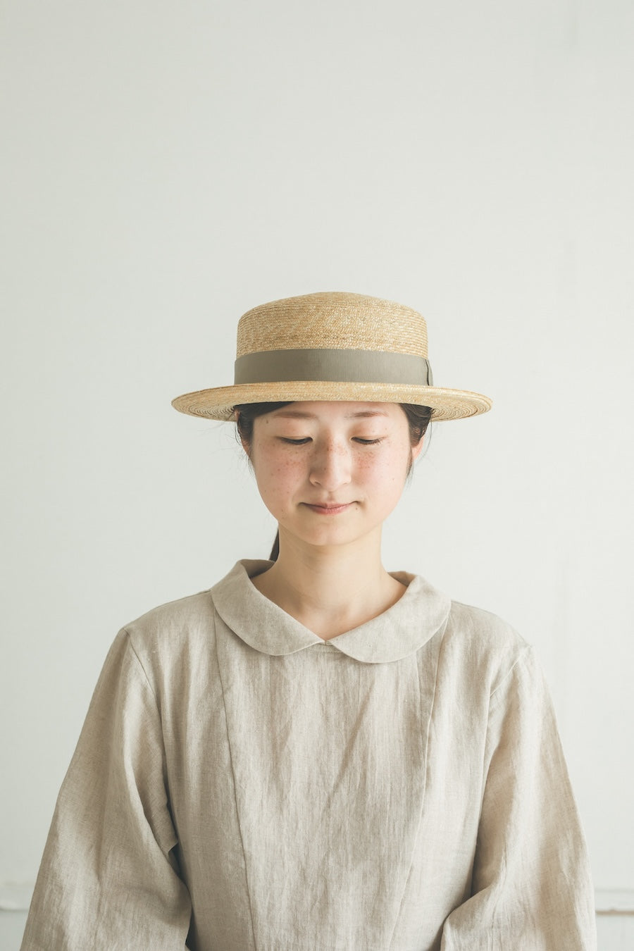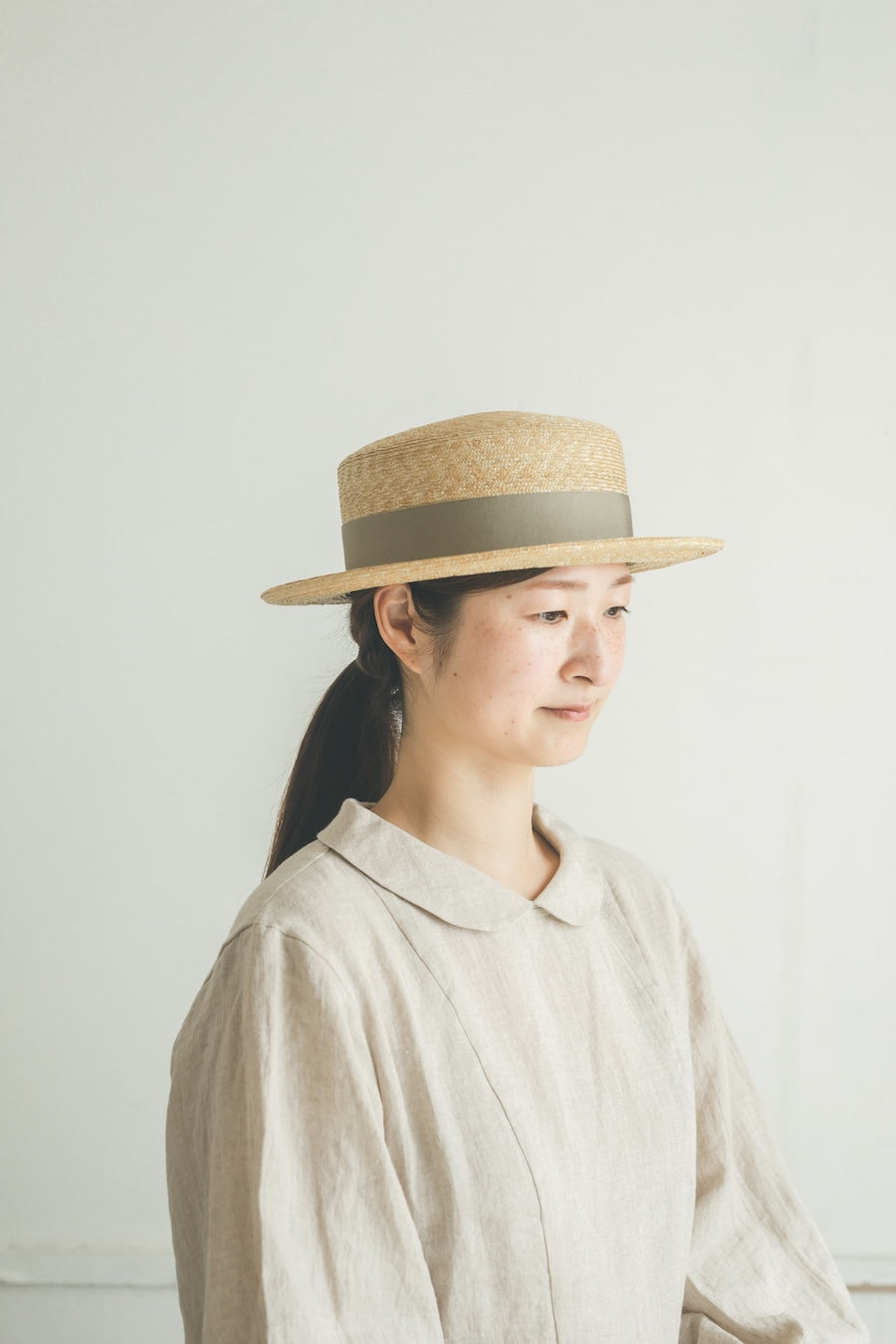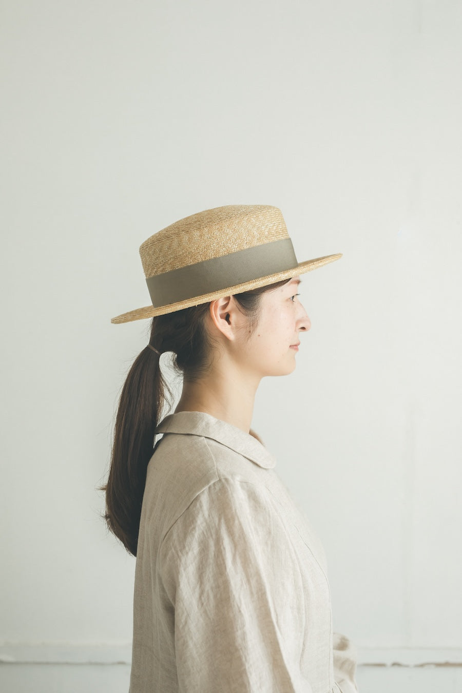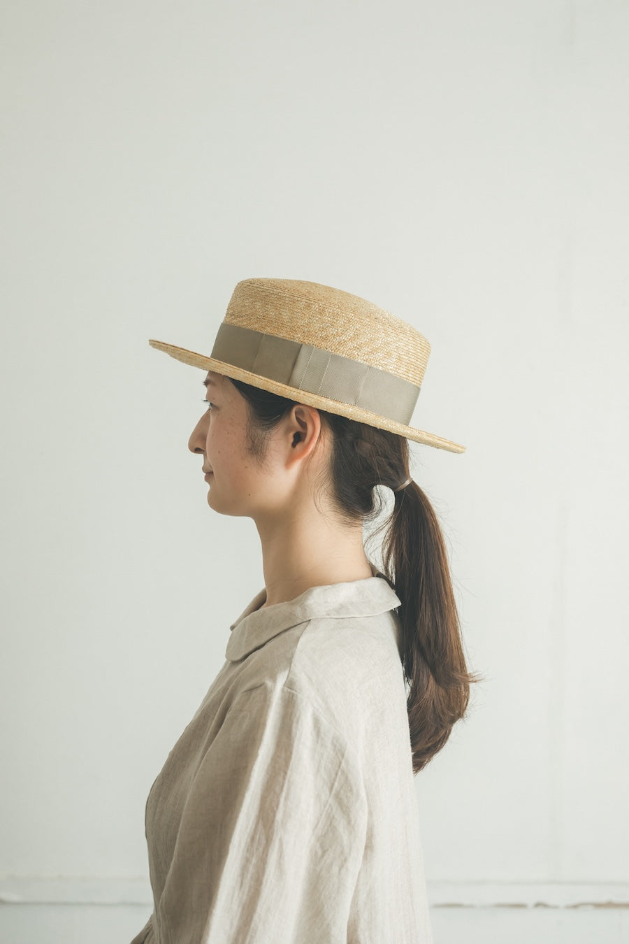 浅いながらも安定感のあるクラシカルな帽子。極細の麦ブレードを使用して丁寧に作られた帽子、被るその姿はとても美しいです。付属の黒ゴムを後頭部に回して止めると帽子が安定し風に飛ばされにくくなります。内側には絞ることでサイズ調整できる仕様です。【サイズ】 頭囲 55cm〜58cm 帽子の高さ 8cm つばの広さ6.5cm 【素材】 麦
