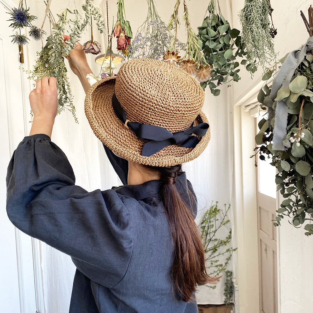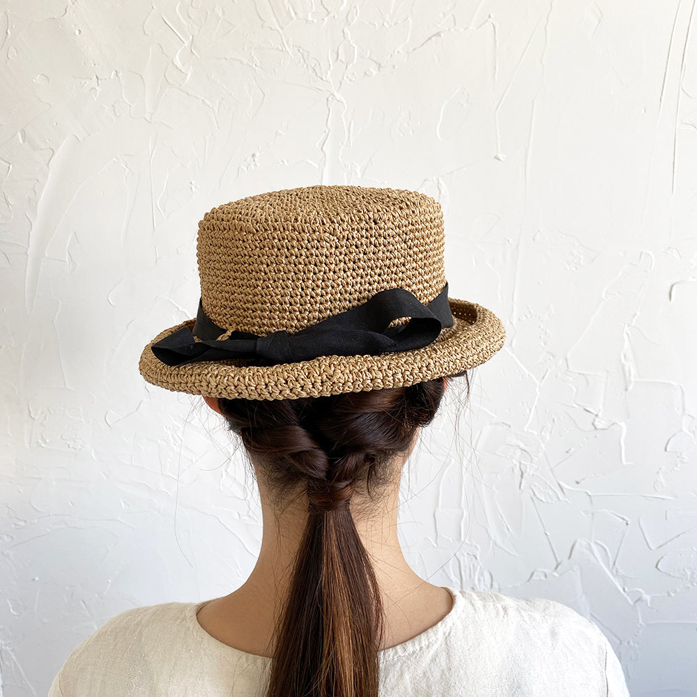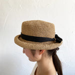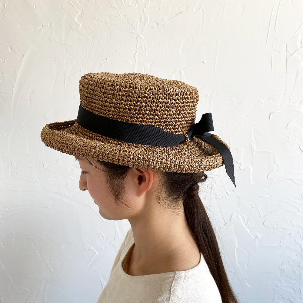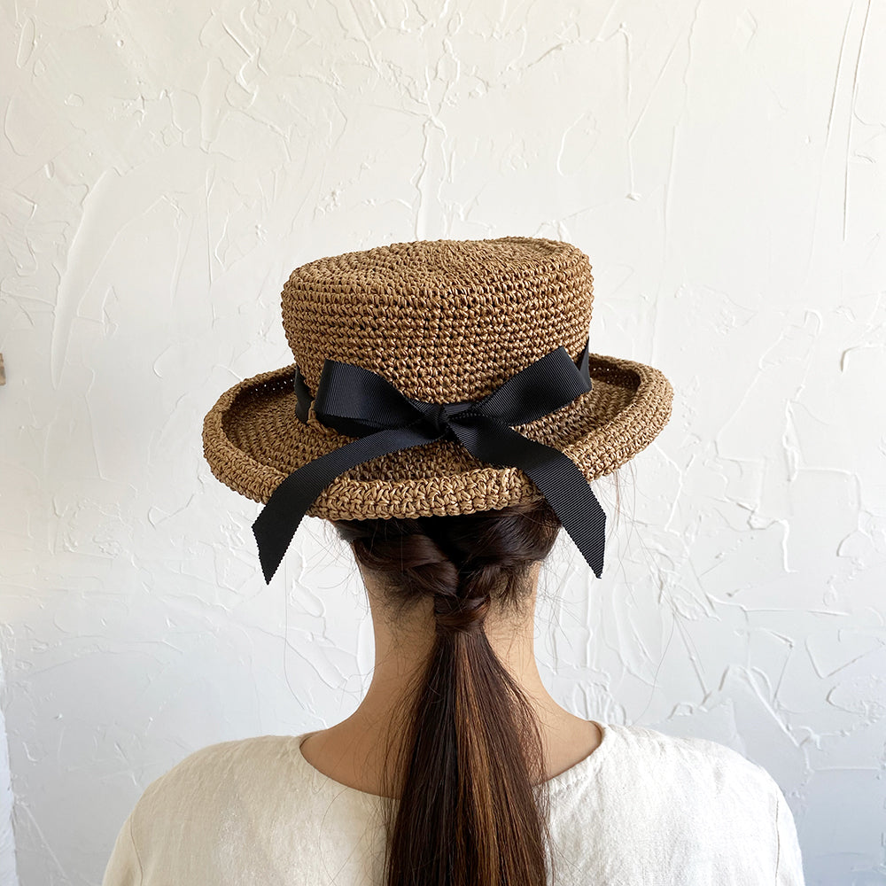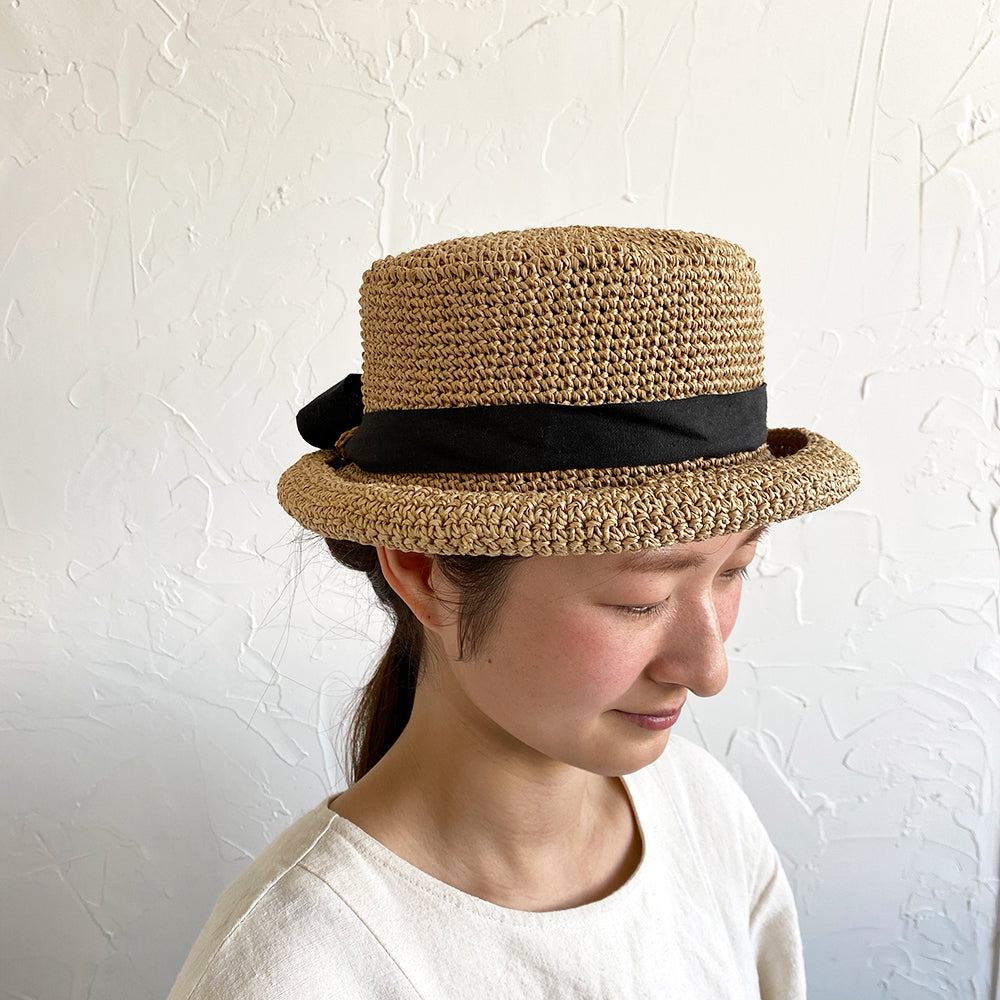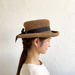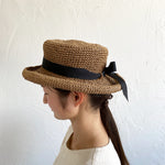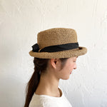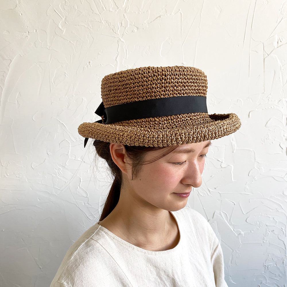 KIKONO定番の手編み帽子。 ひと編みひと編み丁寧に編まれてつくられた帽子は優しく心地よく頭にフィットします。 可愛さと落ち着いた印象が混ざり合った、どんなスタイルにも合わせやすい帽子です。 風が通り抜けるので、自転車に乗っても飛ばされることはありません。 原料のくま笹は天然の抗菌やUVカットの効果もあります。 永くお使いいただけるように、KIKONOでは無料でメンテナンスも承ります。 帽子をかぶってお出かけ楽しんでくださいね。 つばが狭めのタイプです。【色】 こげ茶 【サイズ】 頭囲 56cm〜58cm つばの広さ つば広:7cm つば狭:5cm 帽子の高さ 8cm 【素材】 くま笹の糸