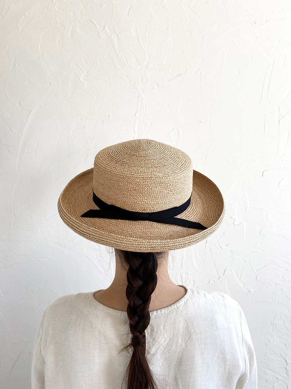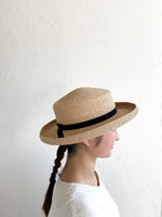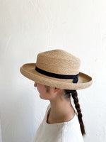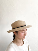 人気の帽子Sofiaを細いラフィアで作りました。 上品でしっかりとした素材、落ち着いた印象の帽子です。ブリムの立ち上がりがクラシックな印象で、どのようなシーンにも使いやすい帽子です。 かぶりやすく合わせやすい、お洋服にも馴染みやすく飽きがこず、 末長くご愛用していただける帽子です。 付属の黒ゴムを後頭部に回して止めると帽子が安定し風に飛ばされにくくなります。内側には絞ることでサイズ調整できる仕様です。 【サイズ】 頭囲 55cm〜58cm つばの広さ 7cm 帽子の高さ 9cm  【素材】 ラフィア