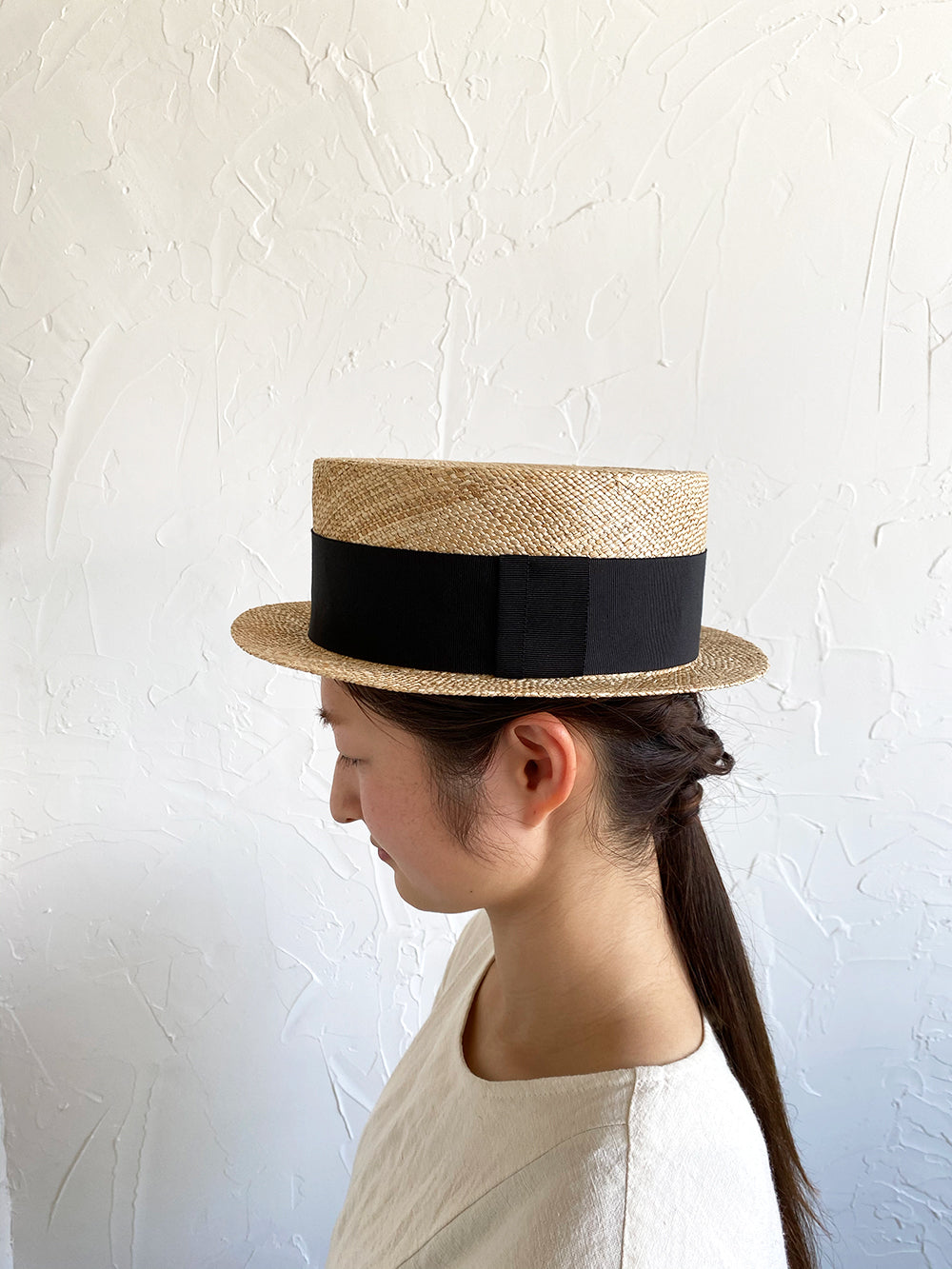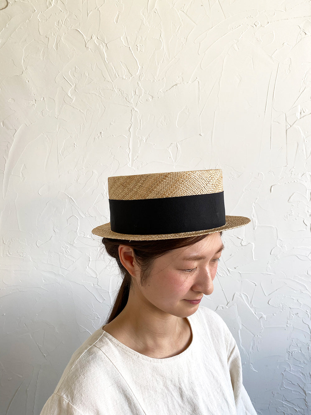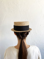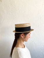 クラシックなカンカン帽のデザイン。つば狭でコンパクトにかぶれてスマートなバランスの帽子。バオ素材(椰子科の植物)で繊細でありながら丈夫な帽子です。被っている事を忘れるくらいの軽さが特徴。ご使用いただくほどにゆっくりと飴色に変化していく過程も楽しんでいただけます。男女共にご使用いただけるユニセックスデザインです。付属の黒ゴムを後頭部に回して止めると帽子が安定し風に飛ばされにくくなります。内側には絞ることでサイズ調整できる仕様です。 【サイズ】 頭囲 55cm〜58cm 帽子の高さ 8.5cm つばの広さ3.5cm 【素材】 バオ(椰子科の植物)