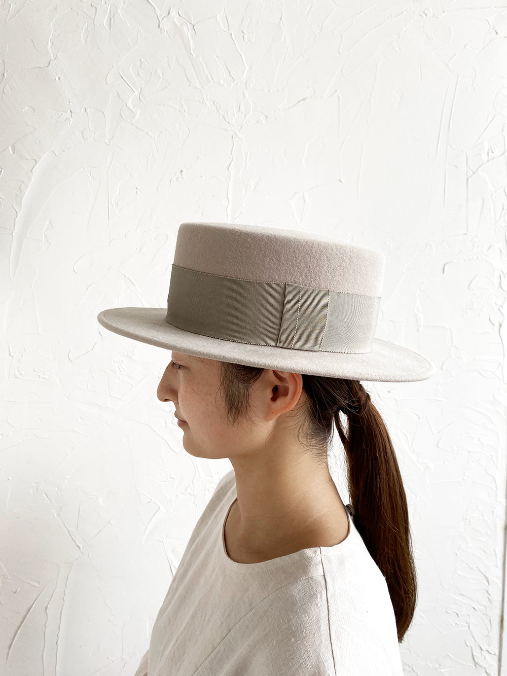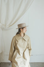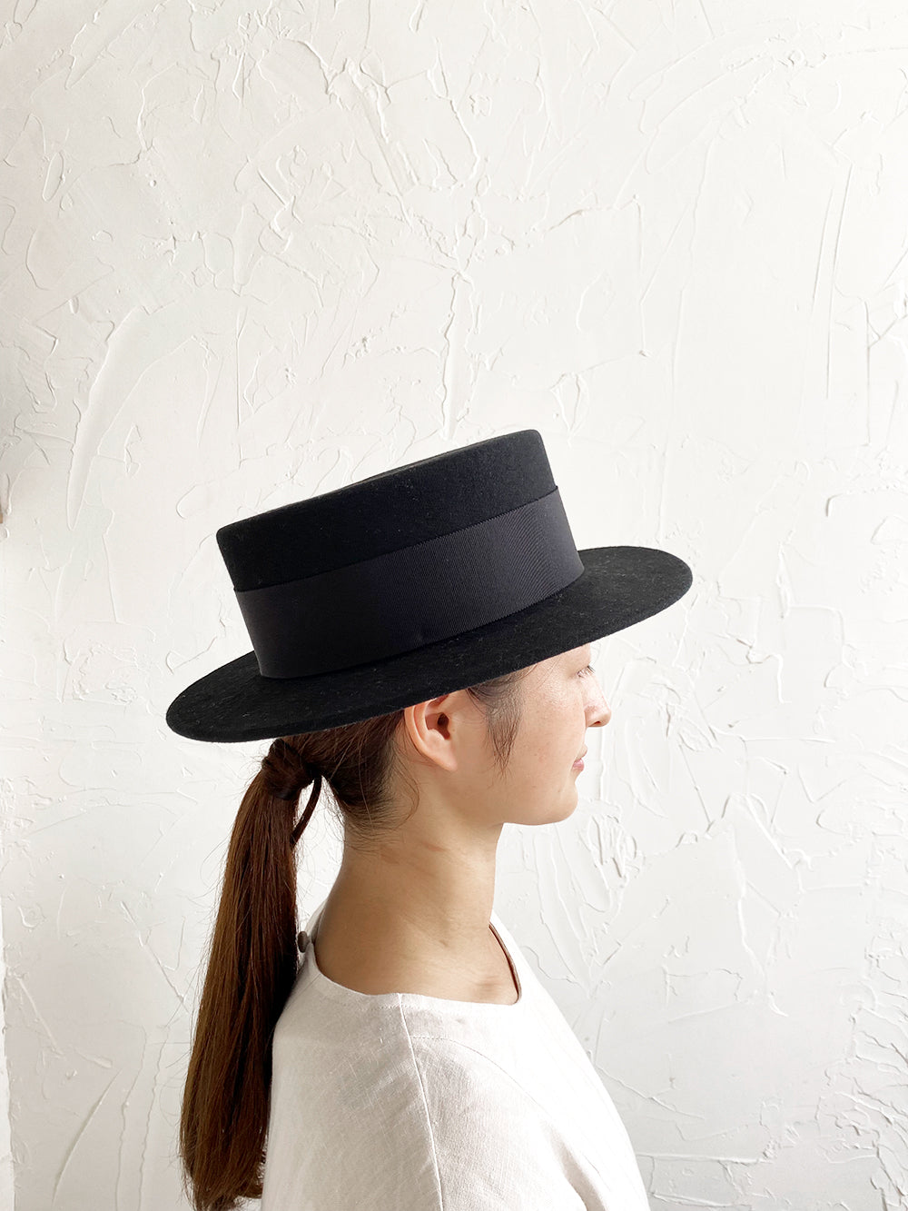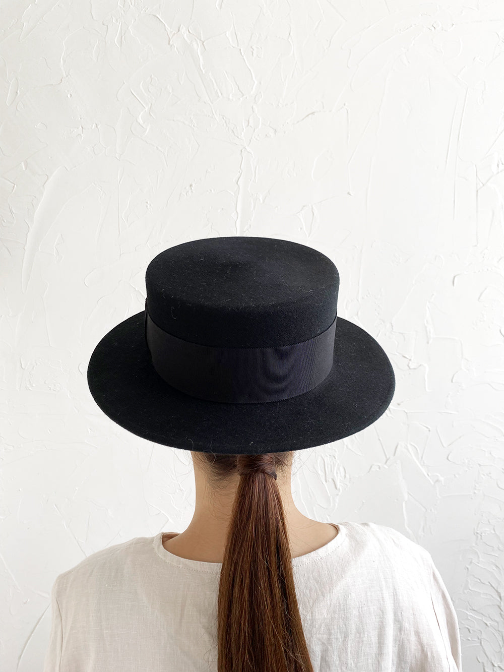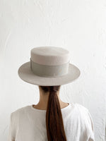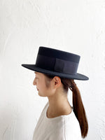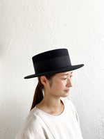 クラシックなカンカン帽のデザイン。ちょうど良いつばの広さと高さのバランスの良い帽子。ウールの素材のカンカン帽はスタイリッシュです。男女共にご使用いただけるユニセックスデザインです。付属の黒ゴムを後頭部に回して止めると帽子が安定し風に飛ばされにくくなります。内側には絞ることでサイズ調整できる仕様です。 【サイズ】 頭囲 55cm〜58cm 帽子の高さ 8.5cm つばの広さ6cm 【素材】 ウール