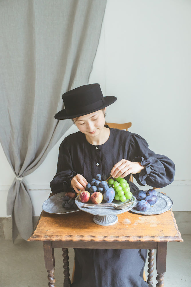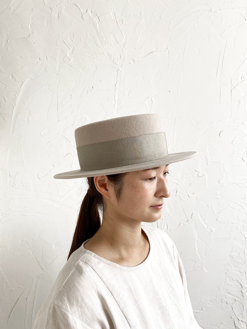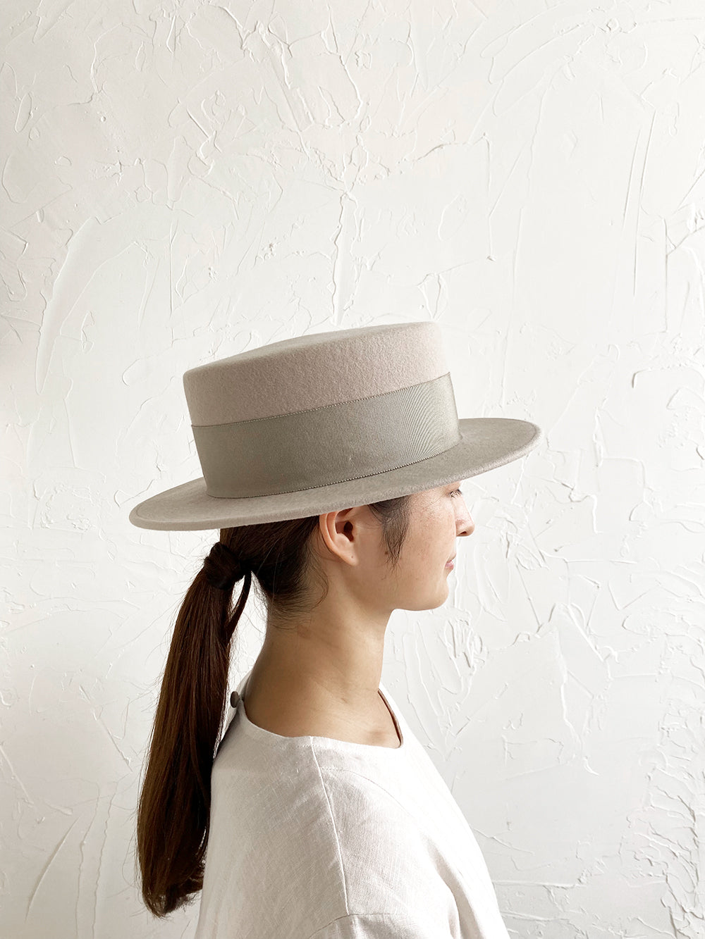 クラシックなカンカン帽のデザイン。ちょうど良いつばの広さと高さのバランスの良い帽子。ウールの素材のカンカン帽はスタイリッシュです。男女共にご使用いただけるユニセックスデザインです。付属の黒ゴムを後頭部に回して止めると帽子が安定し風に飛ばされにくくなります。内側には絞ることでサイズ調整できる仕様です。 【サイズ】 頭囲 55cm〜58cm 帽子の高さ 8.5cm つばの広さ6cm 【素材】 ウール
